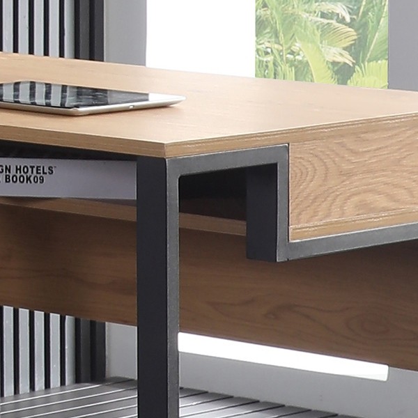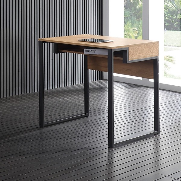 PISALNA MIZA HUNTER je moderna pisalna miza v industrijskem stilu, ki se bo zaradi svoje zanimive oblike in stilskega dizajna odlično podala v vsako pisarno. Pod mizno ploščo se nahaja prostorna, skrita polica, na katero boste lahko odlagali razne knjige in zvezke in na ta način ohranili prosto delovno površino. Lepo in funkcionalno!