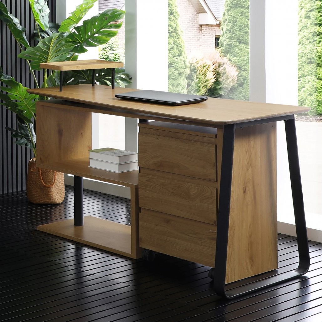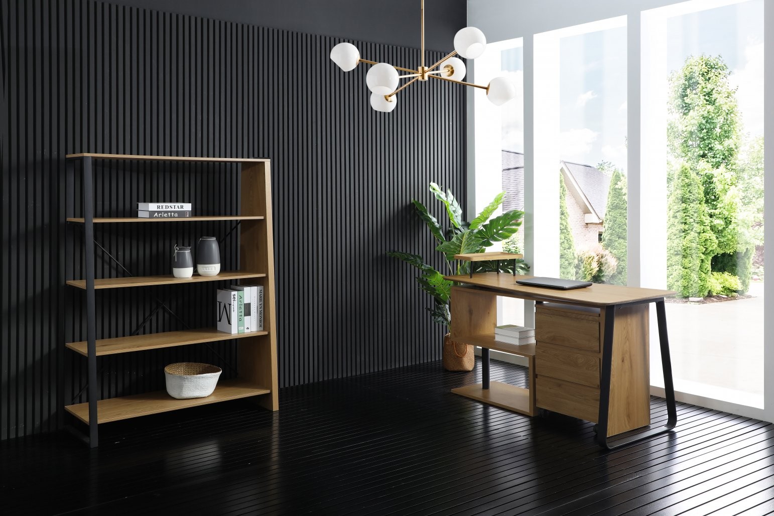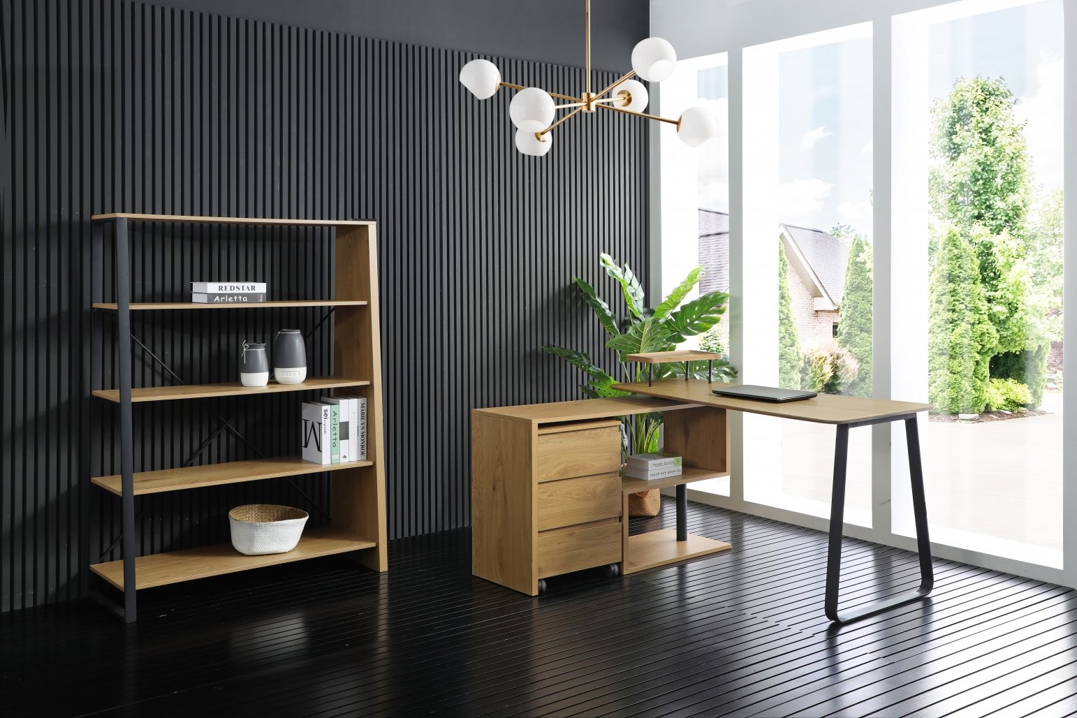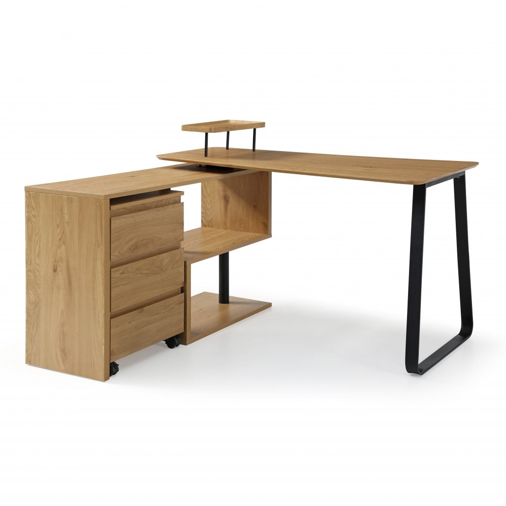 Sodobna pisalna miza PLATIS, ki se raztegne v kotno mizo v obliki črke L, z dodatno poličko in možnostjo shranjevanja.