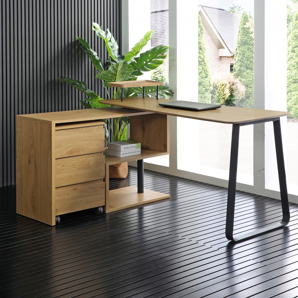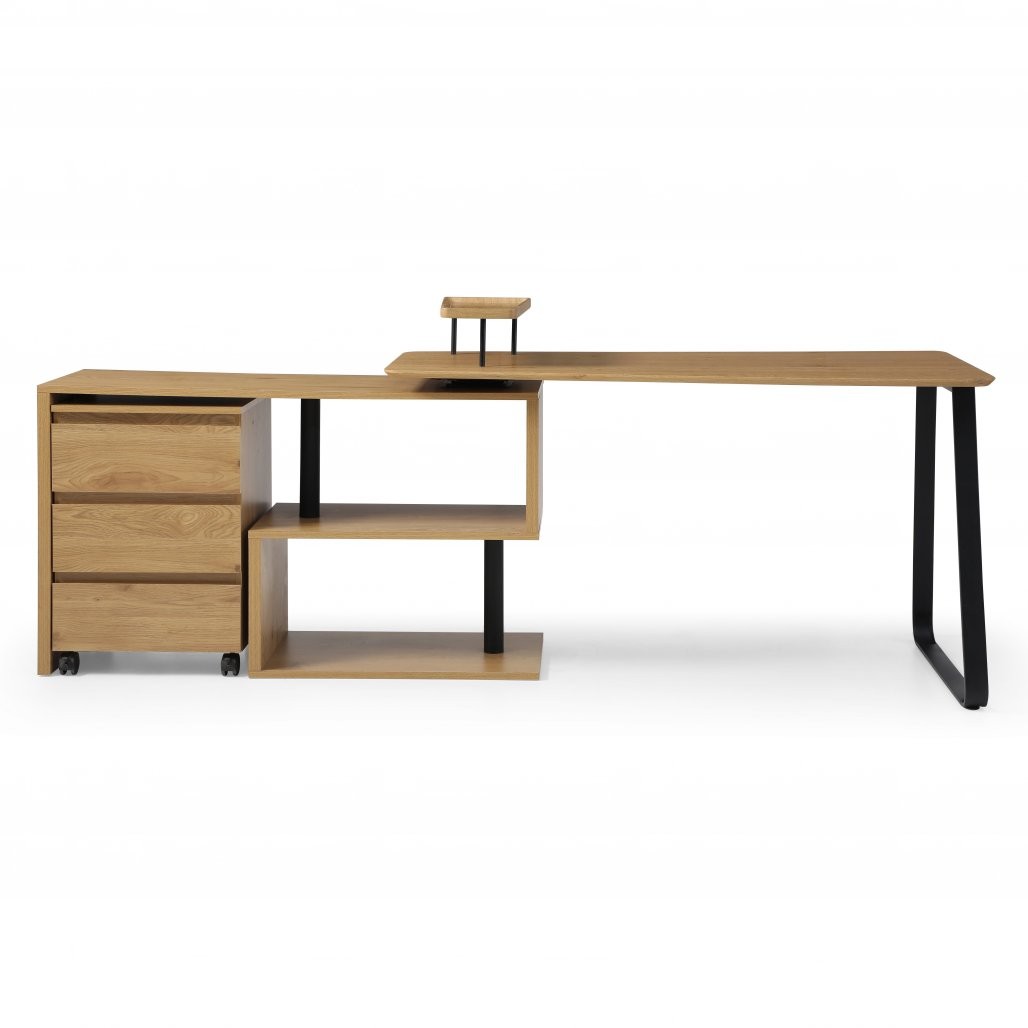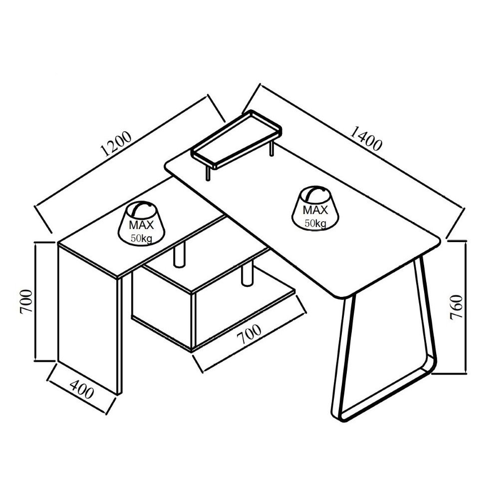 - Manjša miza se lahko namesti pravokotno na glavno ploščo, da se ustvari kotna miza v obliki črke L, ali pa vzporedno, da se ustvari ena sama pravokotna delovna površina na dveh nivojih