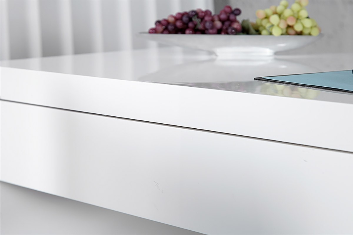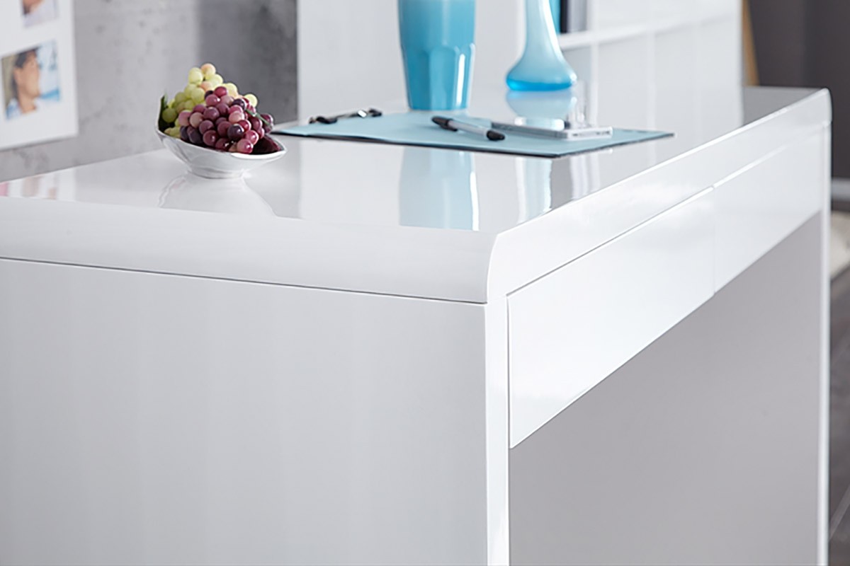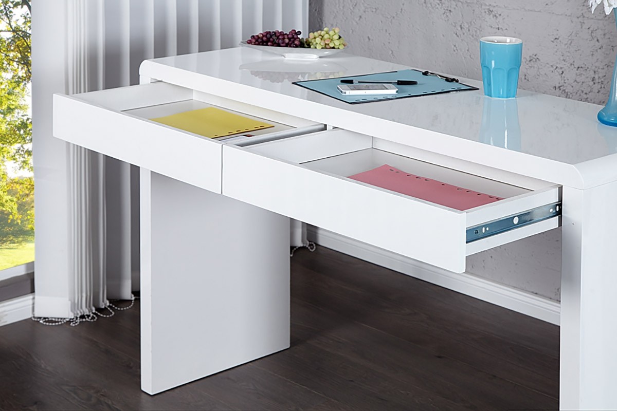 PISALNA MIZA SENSATIO je elegantna miza v beli barvi, ki bo poskrbela, da bo vaš prostor videti svetlejši in bolj prefinjen. Izdelana je iz kvalitetnega MDF materiala, ki bo poskrbel za dolgoletno nemoteno uporabo. Miza ima dva predala, kamor boste lahko pospravili papirje, zvezke, pisala, in ostalo pisarniško galanterijo, in tako ohranili čisto in pospravljeno delovno površino. Predala sta brez kljuk, kar jima da še bolj minimalistični in elegantni videz. Predala se preprosto odpirata. Stranice mize so debeline 40cm, zgornja plošča mize je na skrajnem levem in desnem robu rahlo zaobljena.