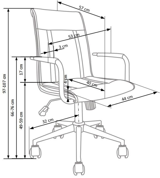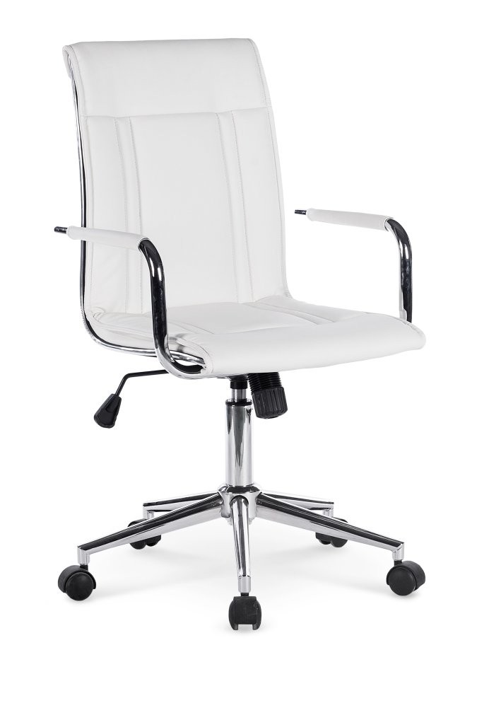Pisarniški stol Cern s klasičnim nagibnim mehanizmom in oblazinjenjem v belem umetnem usnju. Praktična in udobna izbira za pisarne, s fiksnimi nasloni za roke ter nastavljivo višino sedeža.