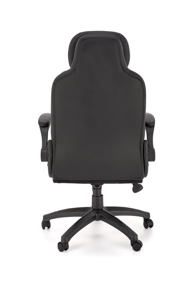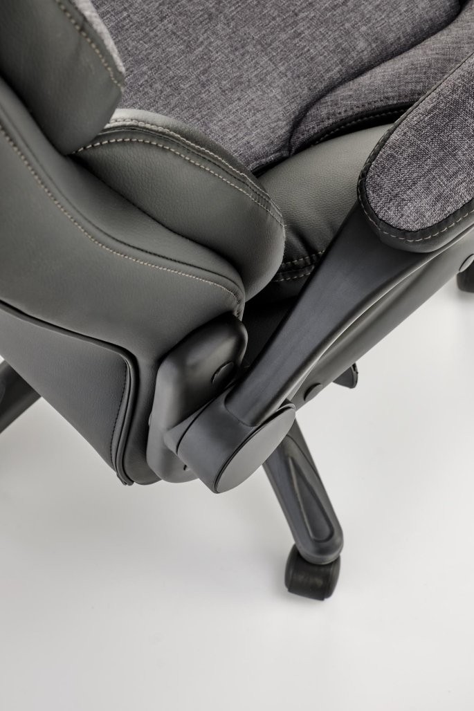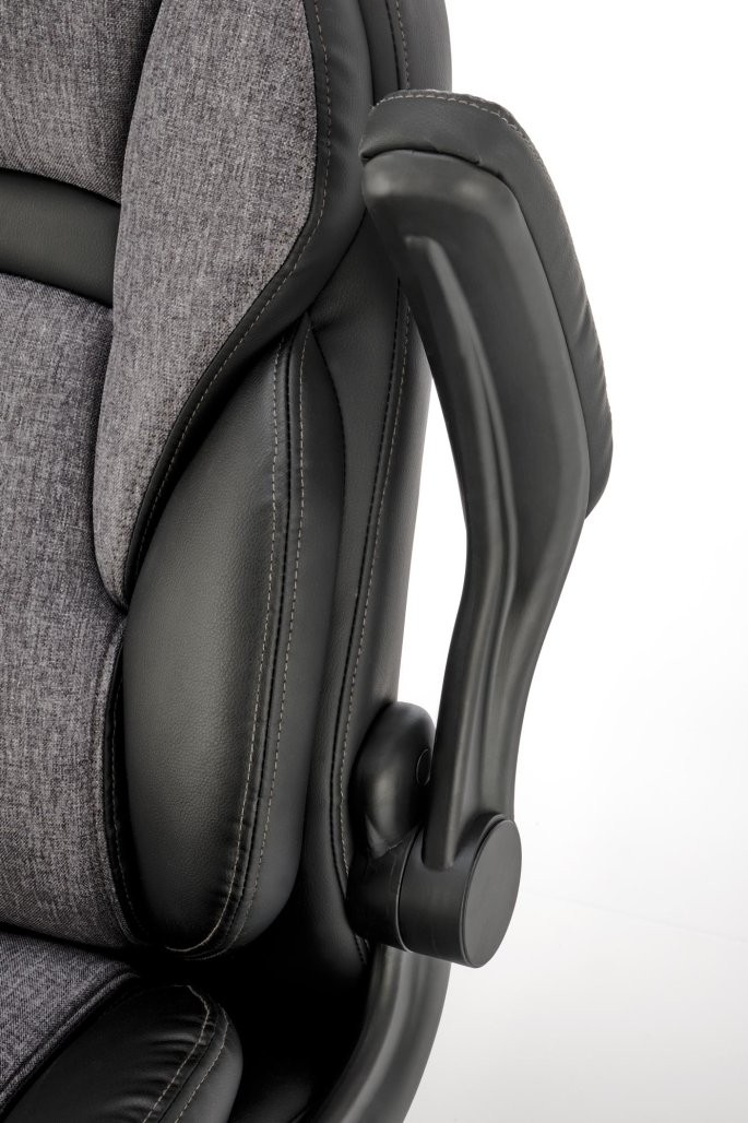 Pisarniški stol Elron s funkcijo nagiba, oblazinjen v umetno usnje in tkanino v črno-sivi barvni kombinaciji. Idealen za pisarne ali domače delovne prostore.