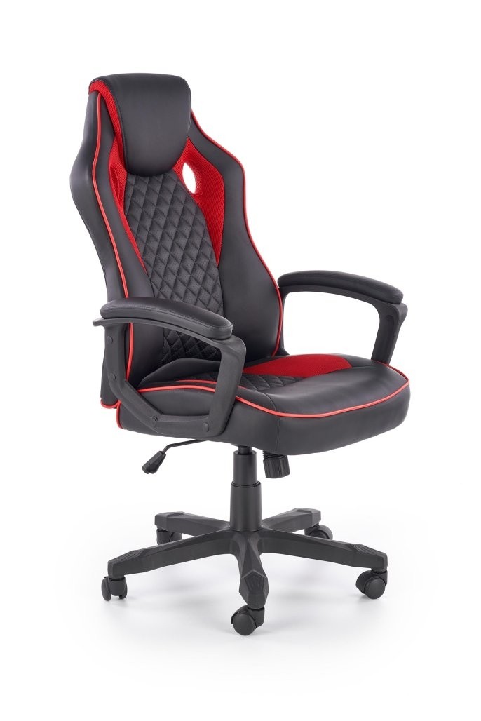 Pisarniški stol Eris z nagibnim mehanizmom in črnim eko usnjem z rdečimi poudarki je udobna izbira za igralne sobe. Udobno oblazinjenje in prilagodljivost zagotavljata ergonomsko podporo.
