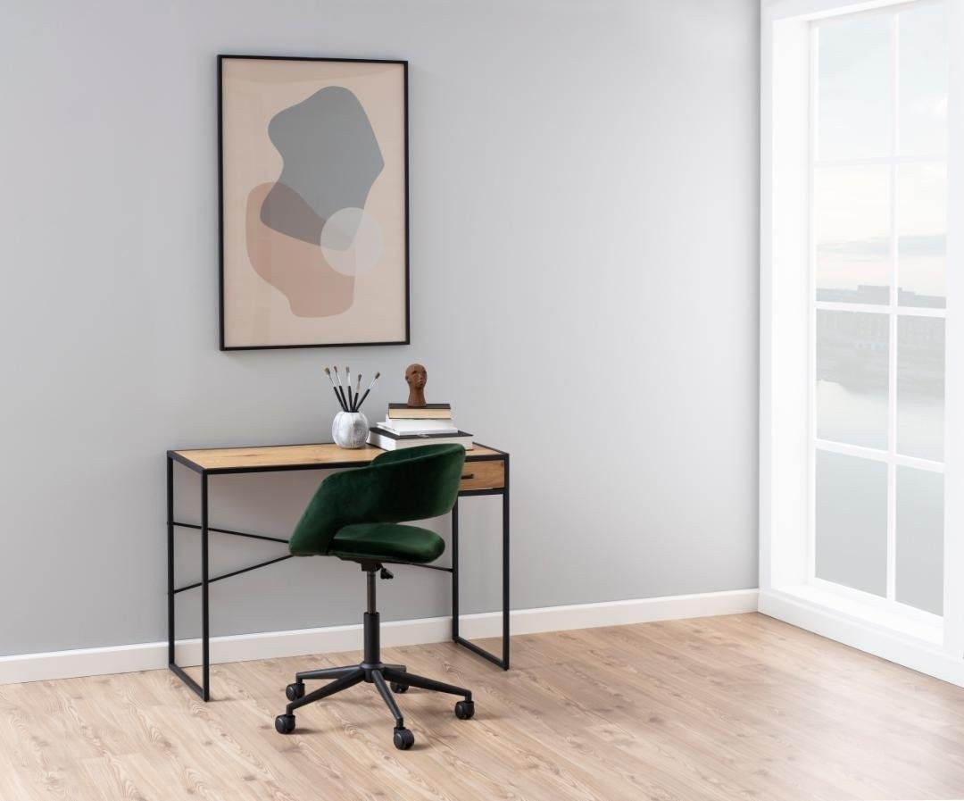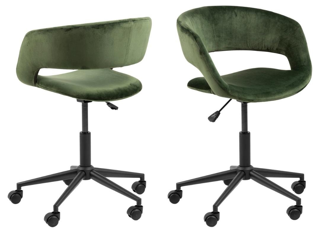 Moderen pisarniški stol GIDEON z žametnim sedežem in odprtim hrbtiščem je zasnovan tako, da poživi prostor. Višino sedeža lahko enostavno prilagodite in se premikate na stolu zahvaljujoč funkciji vrtenja. 5-kraka črna kovinska osnova je opremljena tudi z mehkimi zavorami na kolesih, ki preprečujejo premikanje stola, ko na njem ne sedite.
