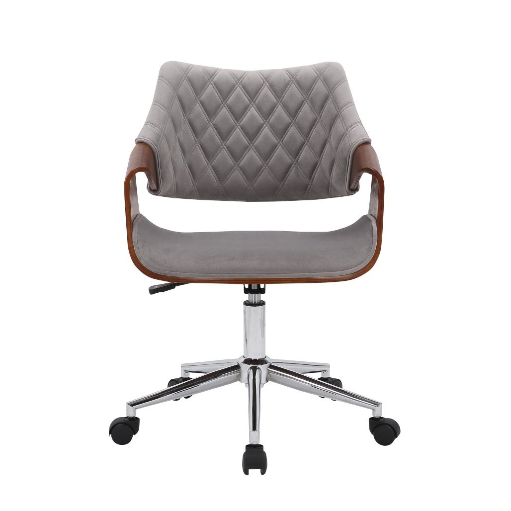 Pisarniški stol Islor z upognjenim vezanim lesom in žametnim oblazinjenjem v sivi barvi. Praktičen stol s preprostim dvižnim mehanizmom, dimenzije 80-90 x 58 x 64 cm.