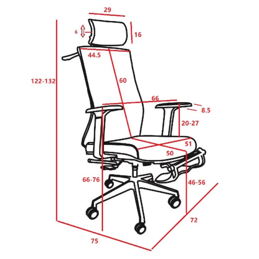 Podnožje je iz aluminija in ima 5 poliuretanskih kolesc. Maksimalna obremenitev stola je 100 kg. Hrbtišče ima nastavljivo ledveno oporo.