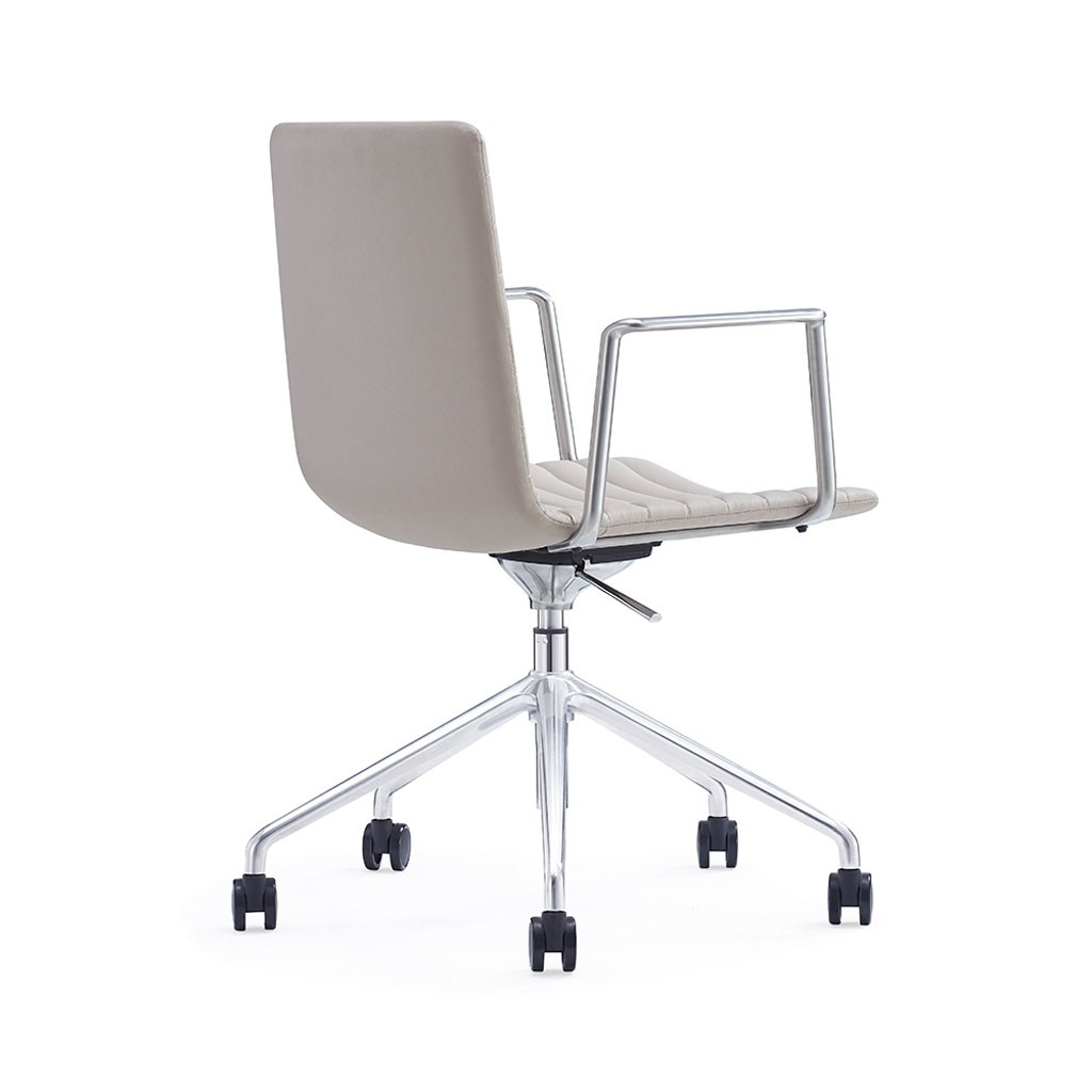Pisarniški stol MURTI je moderno oblikovan stol, ki je oblazinjen v elegantno umetno usnje v nevtralni sivi barvi. Stol MURTI je vrtljiv in nastavljiv po višini, ima pa tudi sedišče napoljeno s peno visoke gostote za maksimalno udobje. Aluminijasti rokonasloni in podnožje pripomoreta k bolj elegantnemu videzu.