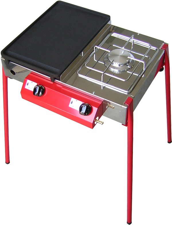 Plinski žar Gorenc, 51 x 40, s kuhalnikom, litoželezna plošča, z nogami, ki ga lahko postavite kamorkoli želite. Okvir plinskega žara je sestavljen iz nerjaveče pločevine. Plinski žar je opremljen s kuhalnikom in litoželezno ploščo. Lahko izbirate med gladko ali rebrasto ploščo.