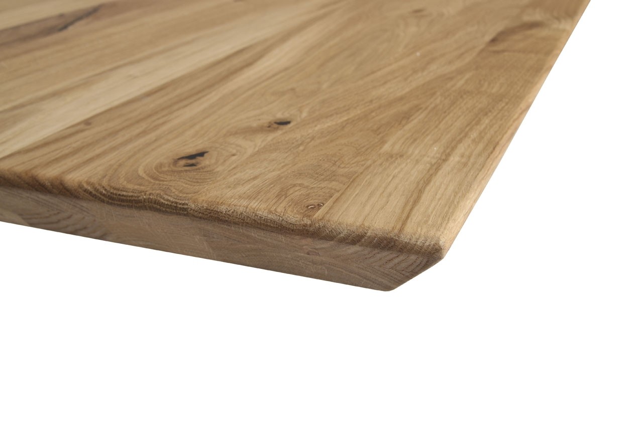 Plošča za mizo CONNECT s švicarskim robom je narejena iz masivnega oljenega hrastovega lesa in je rustikalnega videza. Plošča debeline 2+2 mm je na voljo v petih različnih dimenzijah.