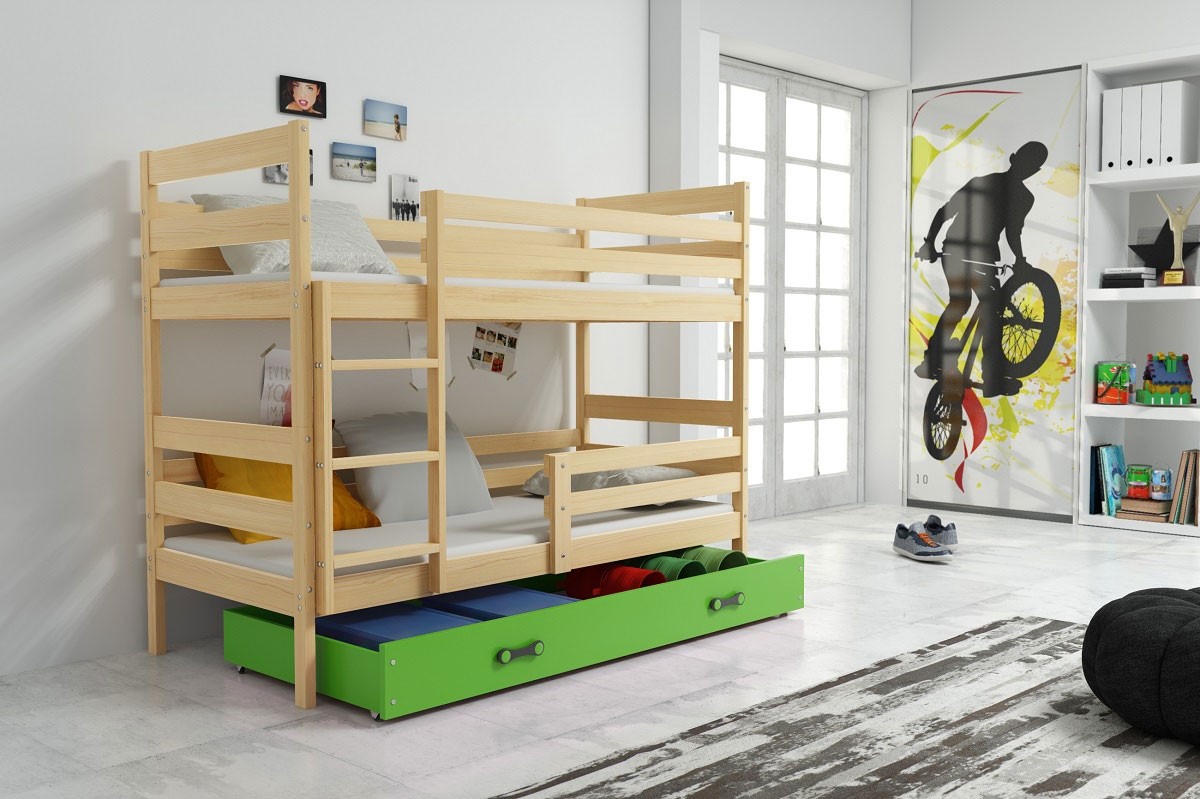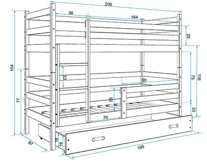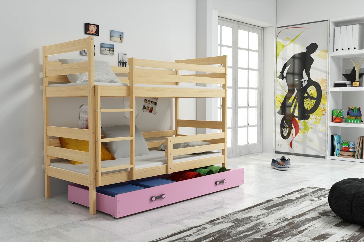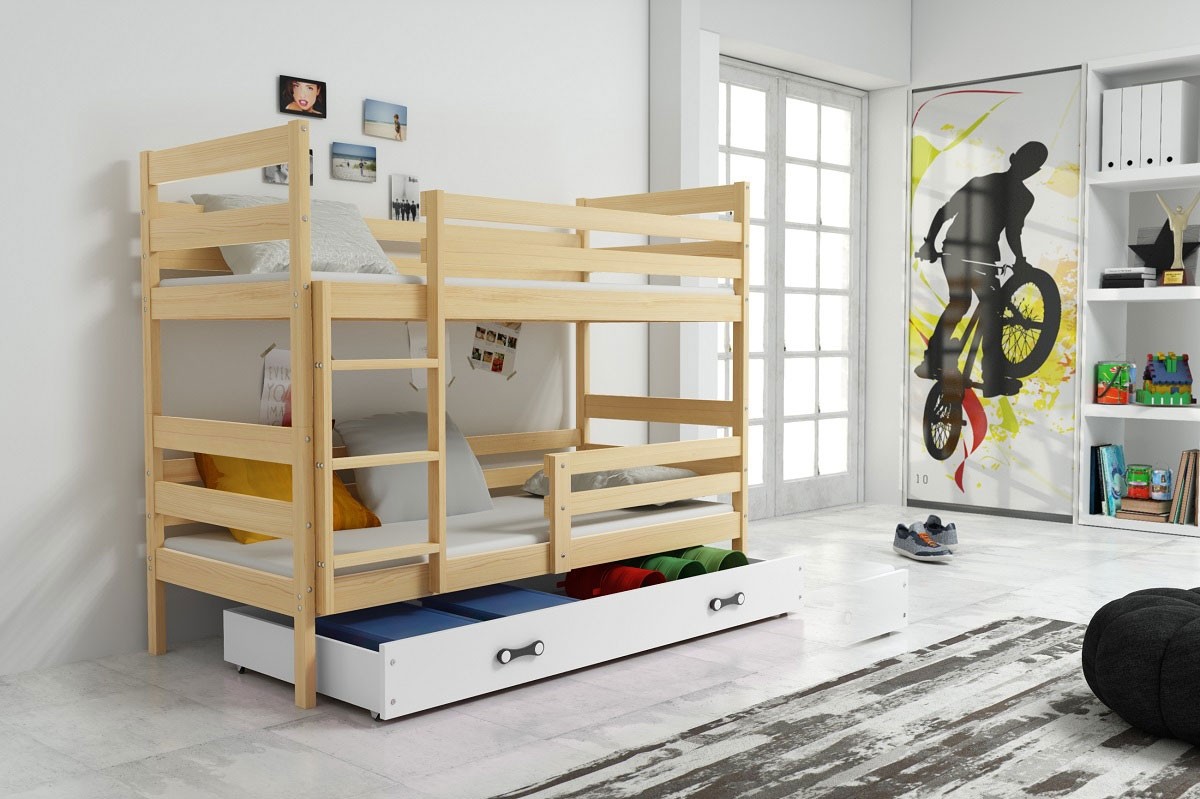 Pograd ERYK nudi udobno spanje vašega otroka, saj čudovit dizajn postelje oživi celotno otroško sobico, kjer bo vaš otrok z veseljem prebival v času igre ali učenja. Poleg postelje dobite tudi dva posteljna poda in dve ležišči. Vsebuje pa tudi predal v katerega lahko shranjujete oblačila ali igrače.