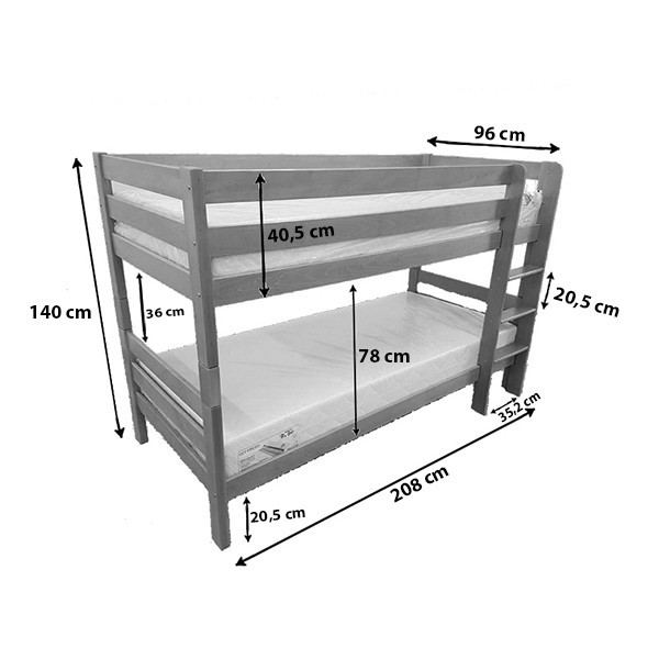Pograd je primeren za vzmetnico dimenzij 90x200 cm, nosilnost posamezne postelje je 80 kg. Debelina pokončnih letev je 4x8 cm.