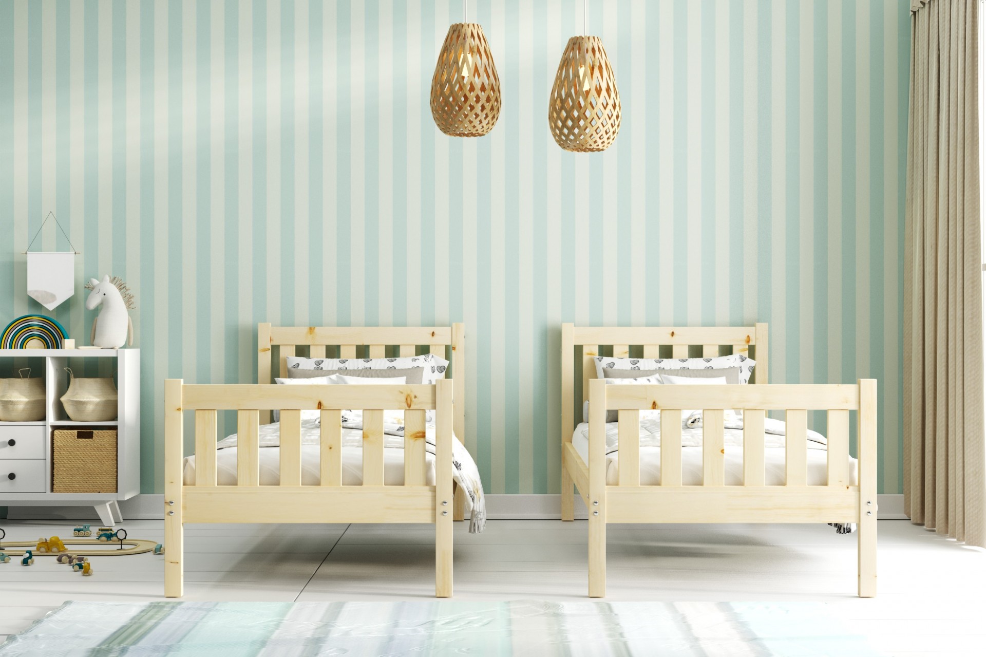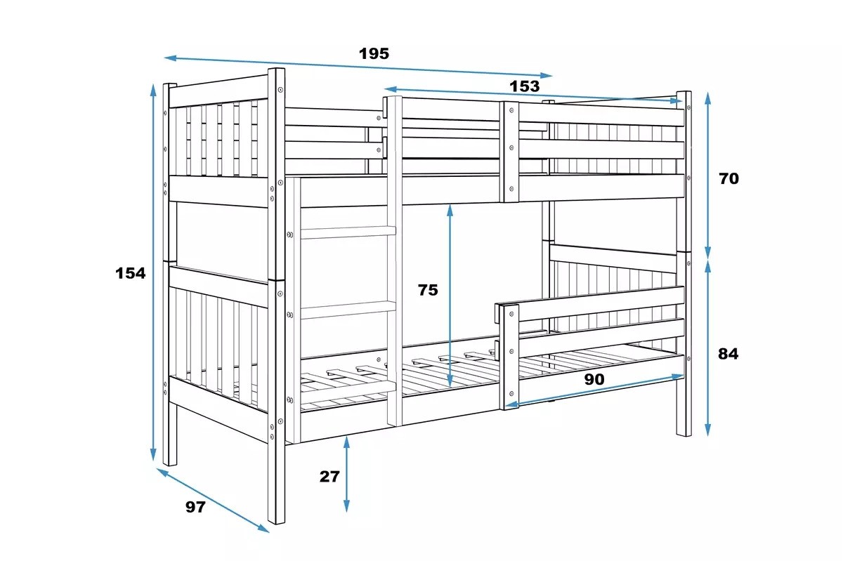 Pograd KACPER je modernega izgleda. Posteljni okvir je narejena iz kakovostne in vzdržljivega borovega lesa, ki ni pobarvan. Pograd lahko preuredite v dve ločeni postelji. Vzmetnica je vključena. Največja nosilnost ogrodja je 100 kg na vsakem nivoju.