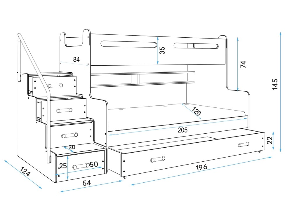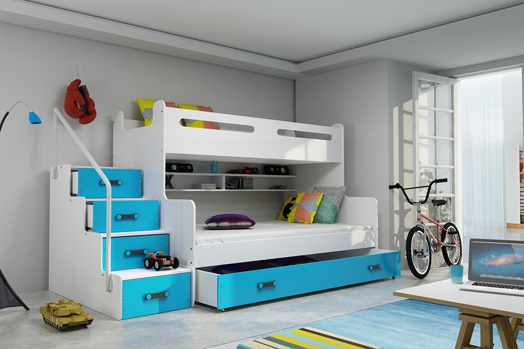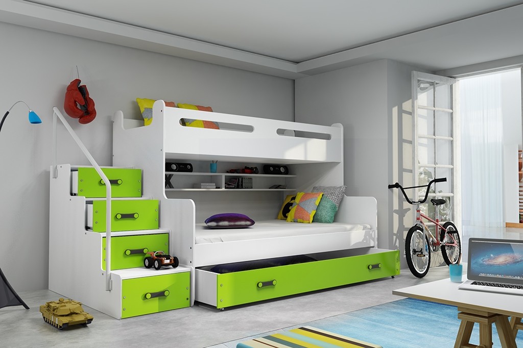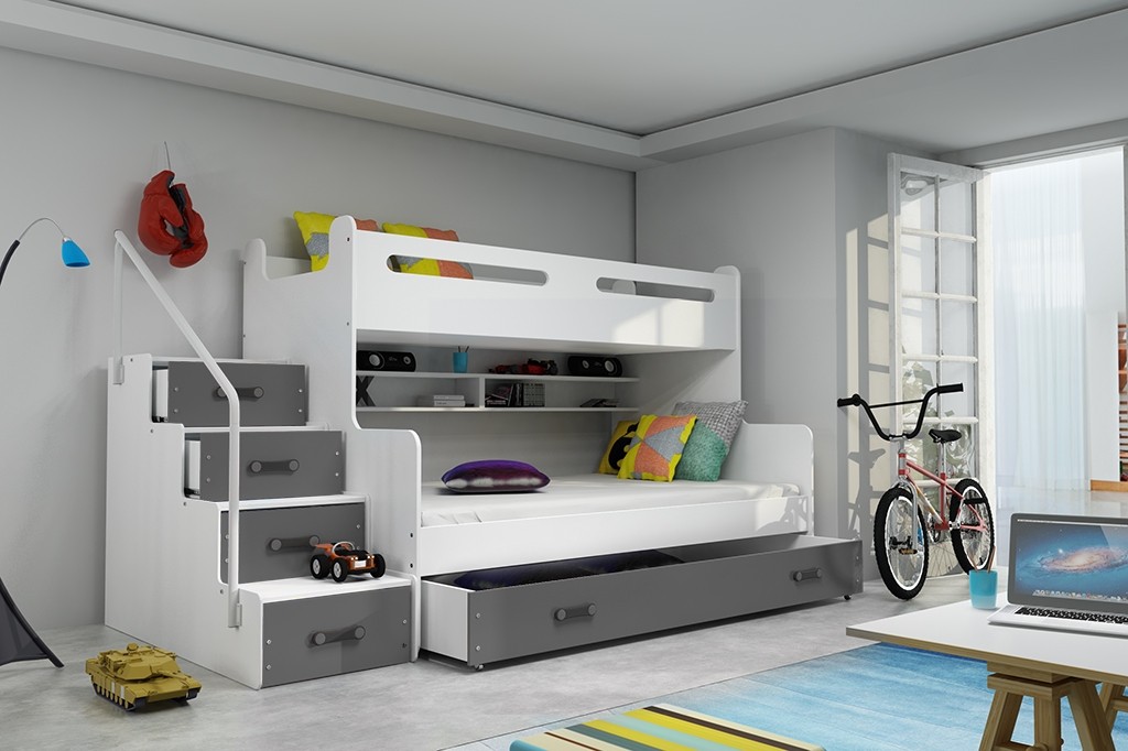 Pri pogradu MAXIM je prostor v otroški sobi odlično izkoriščen, saj je pograd narejen zelo funkcionalno. Namesto klasičnih lestev, so pri pogradu MAXIM super varne in uporabne stopnice, saj stopnice vključujejo predale za shranjevanje. Za izbiro barve predalov pa imate na voljo 5 različnih barv.