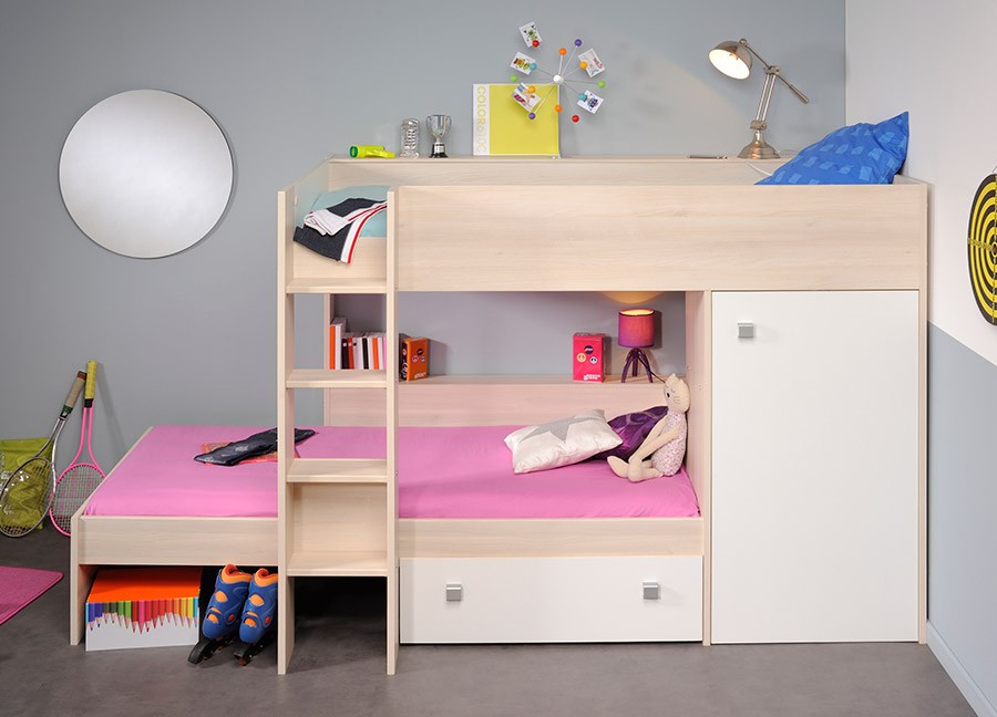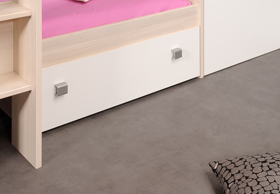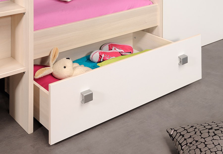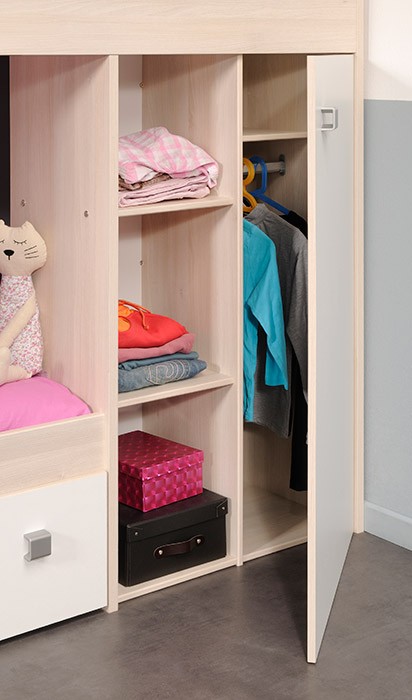 Pograd Ninety je na voljo z dvema možnostima postavitve ležišč in je izredno praktična rešitev za otroško sobo. Pograd ima predal in omaro, ki vsebuje dve polici ter drog za obešanje. Na zgornjem ležišče je tudi dvojna USB vtičnica. Posteljni pod je vključen poleg.