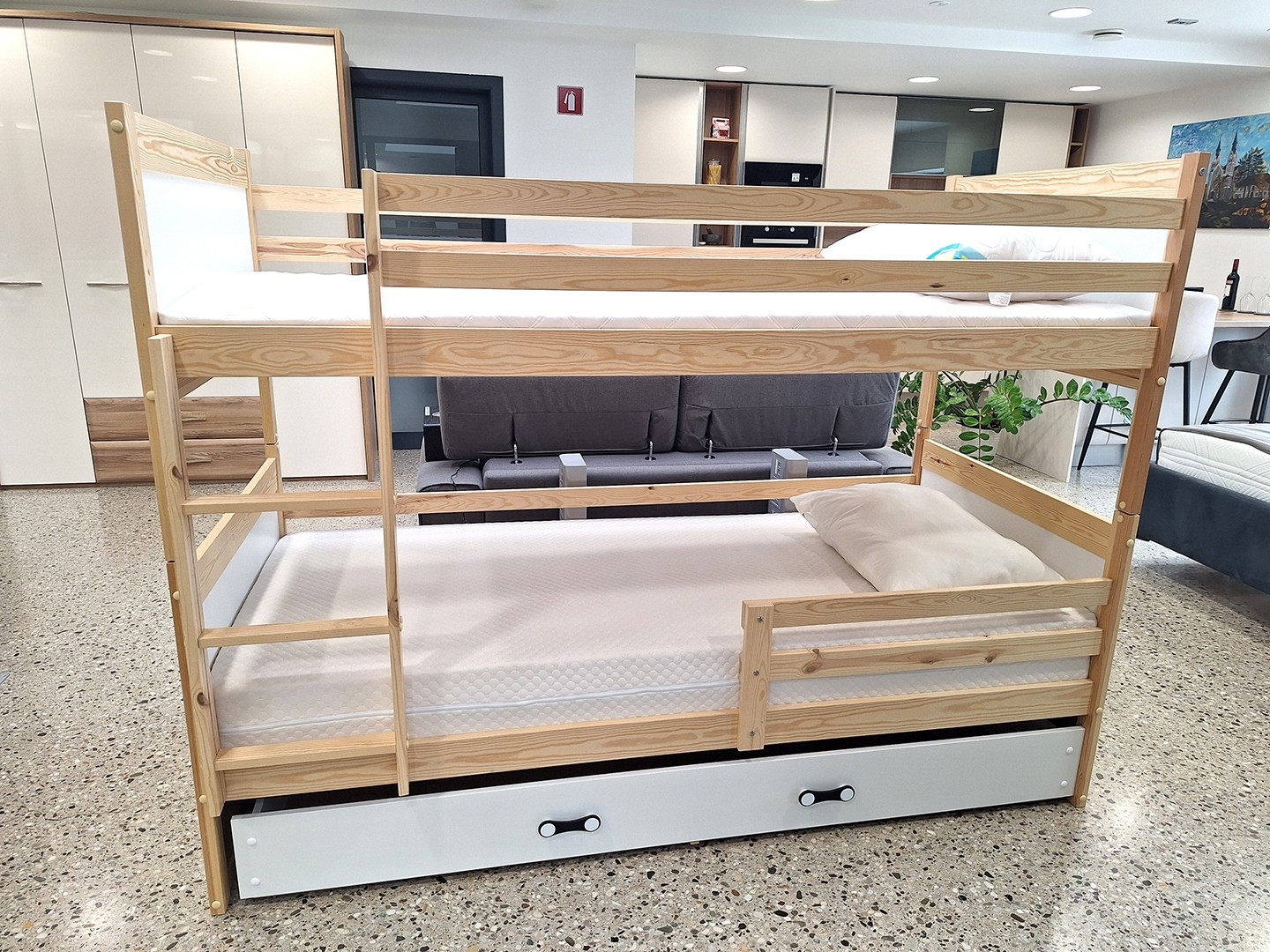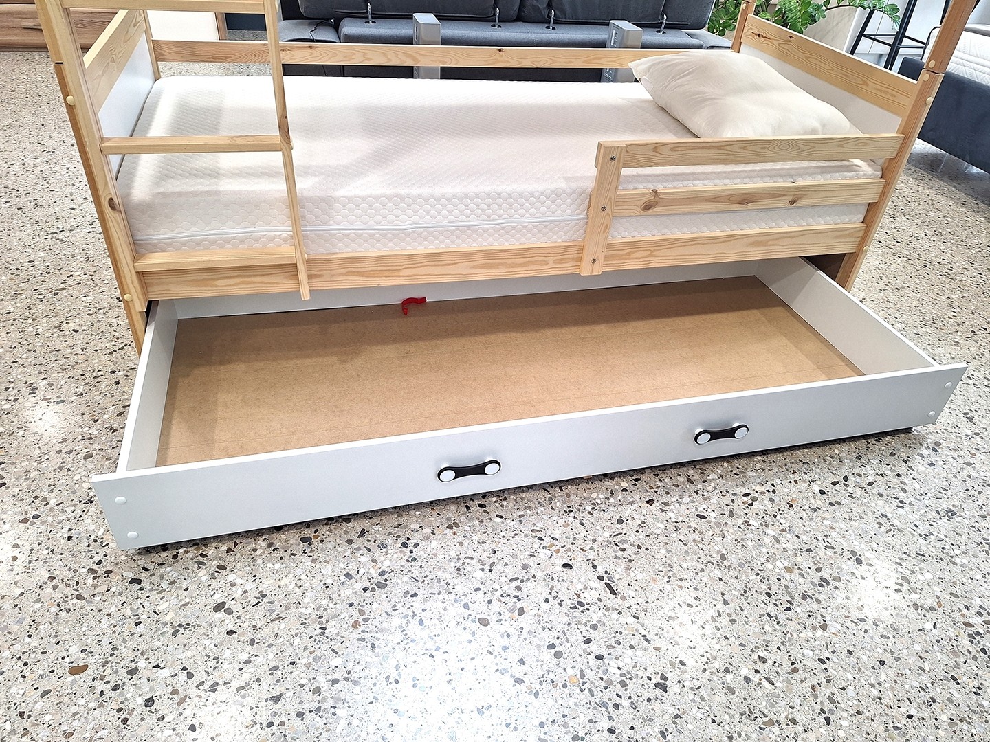 POGRAD RICO 90X200 S PREDALOM nudi vašemu otroku vse kar potrebuje za takojšen in varen spanec! Pograd vključuje dve postelji, ležišči, letvice, varnostni ograjici ter priročen podposteljni predal v katerega lahko shranite posteljnino, igrače, in druge poljubne predmete. Pograd je razstavljen v našem Showroomu in nima znakov uporabe. Na voljo je takoj!