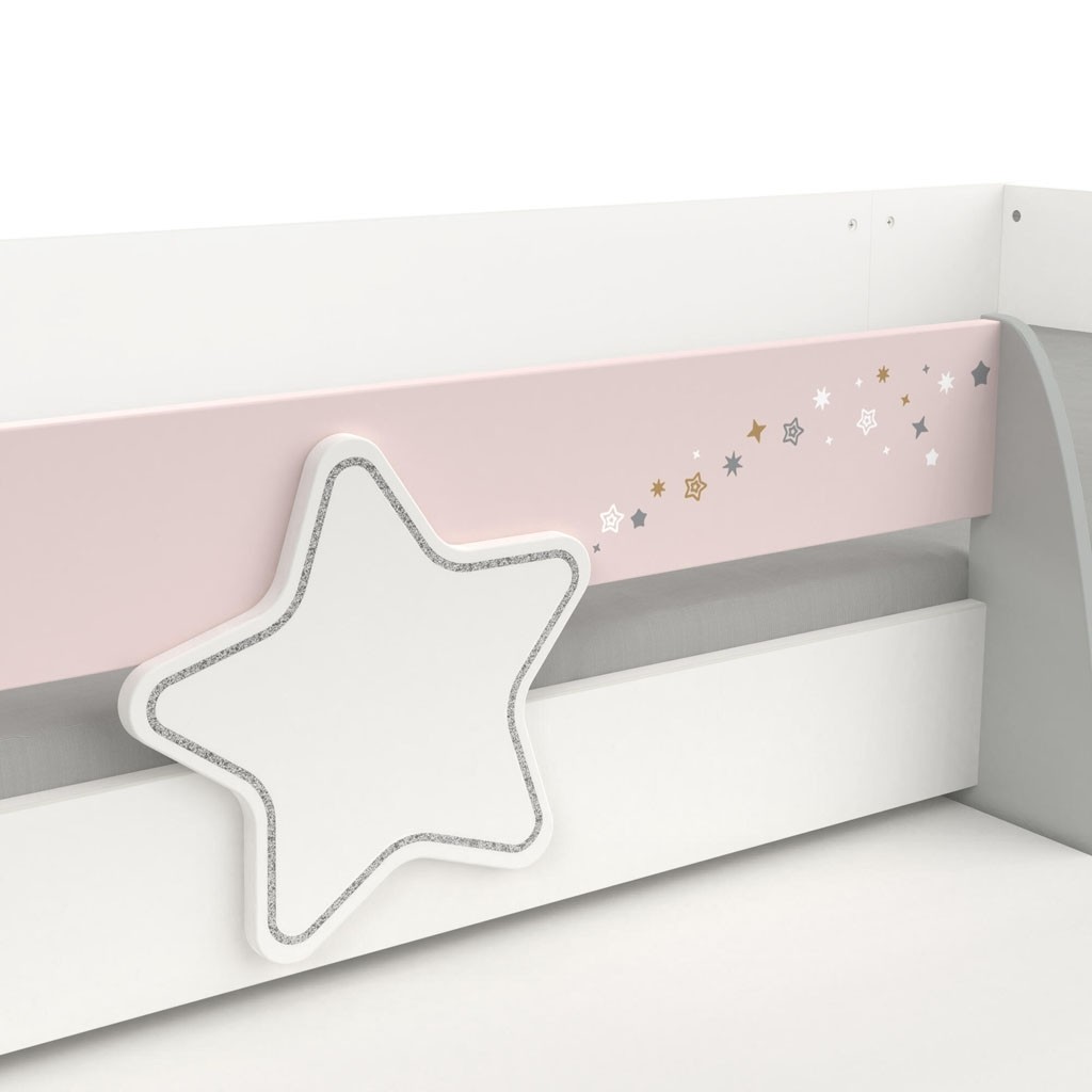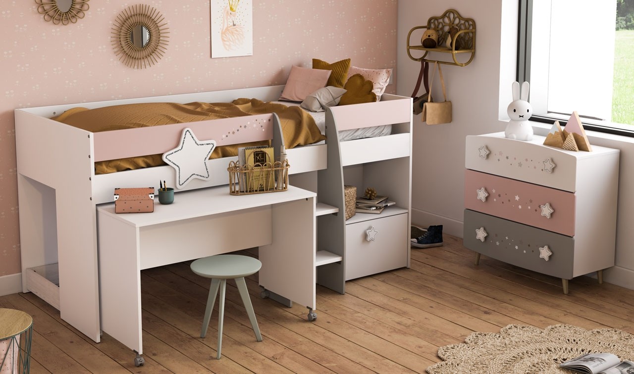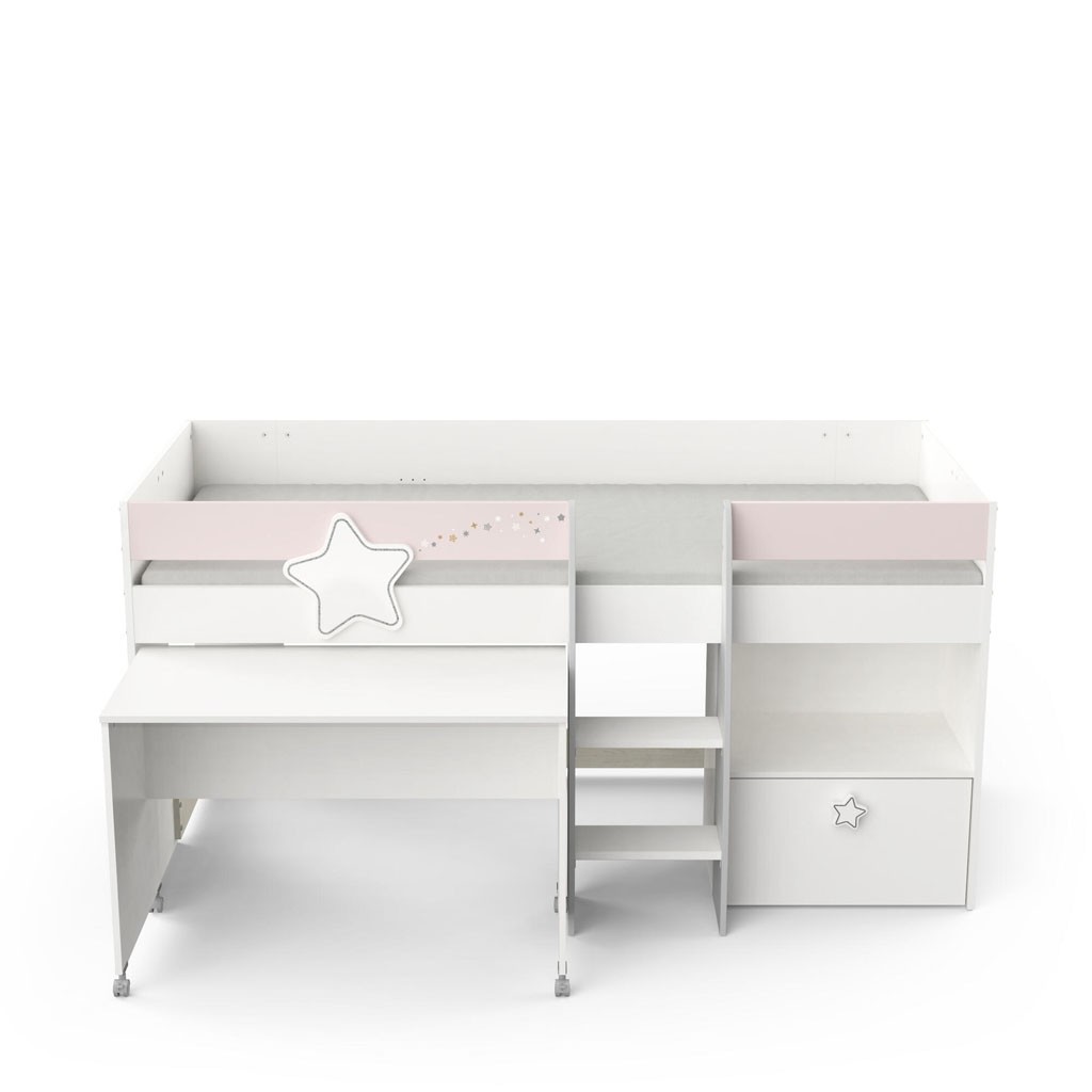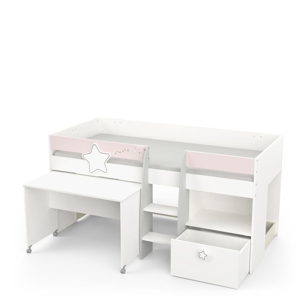 Prilegajoči se komplet postelje in pisalne mize, ki predstavlja rešitev za pomankanje prostora v otroški sobi. Komplet je narejen iz oplemenitene iverne plošče. Ležišče je dvignjeno in primerno za vzmetnico velikosti 90x200 cm. Pisalno mizo podpirajo koleščka, njena maksimalna obremenitev pa znaša 20 kg. Vzmetnica ni priložena.