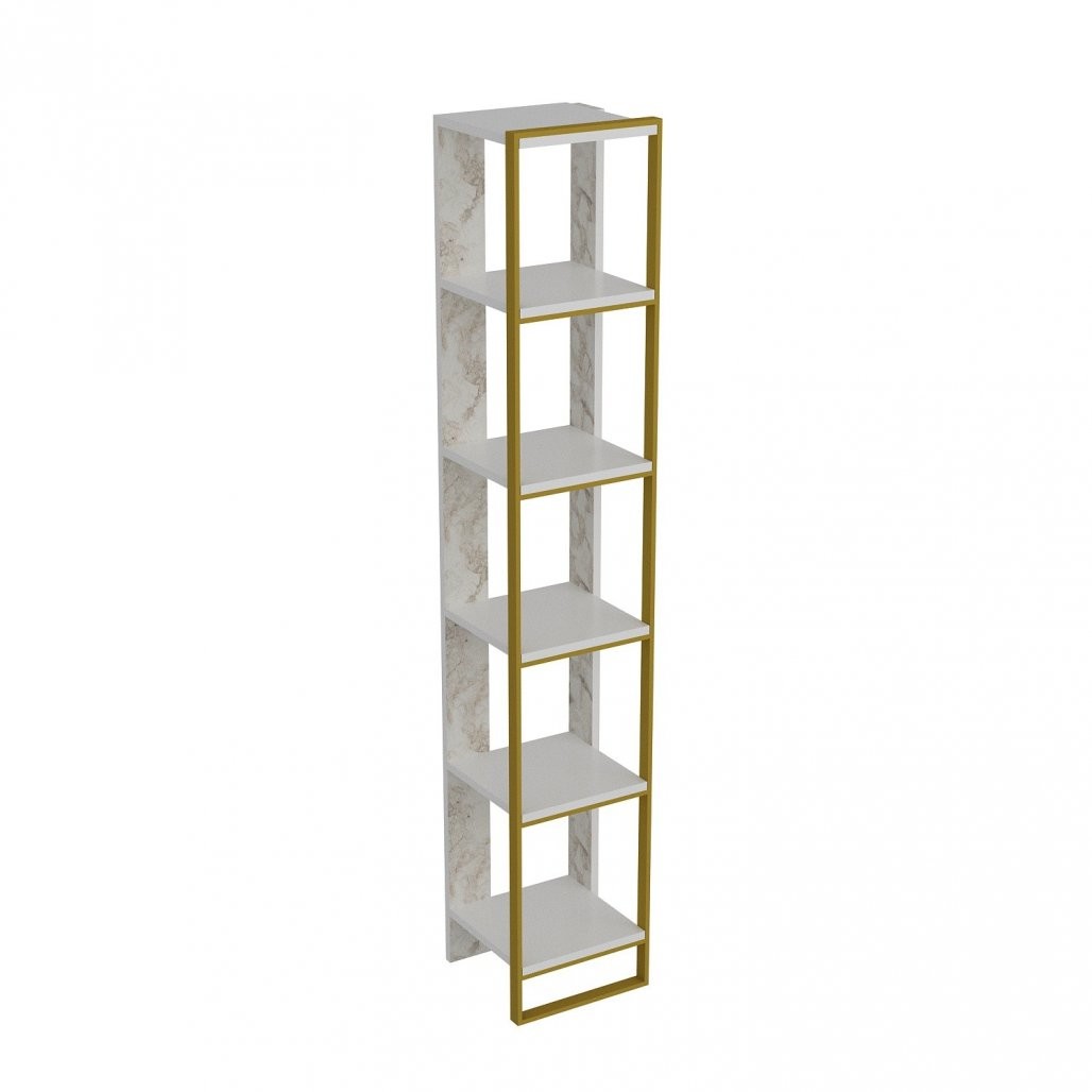 Osupljiv marmornat vzorec naše knjižne police vsakemu prostoru doda pridih prefinjenosti. Upoštevajte, da lahko zaradi narave vzorca pride do manjših odstopanj v barvnem tonu v primerjavi s fotografijami. Kombinacija zlate in bele barve ustvarja harmonično mešanico, ki dopolnjuje vsak notranji dekor.
