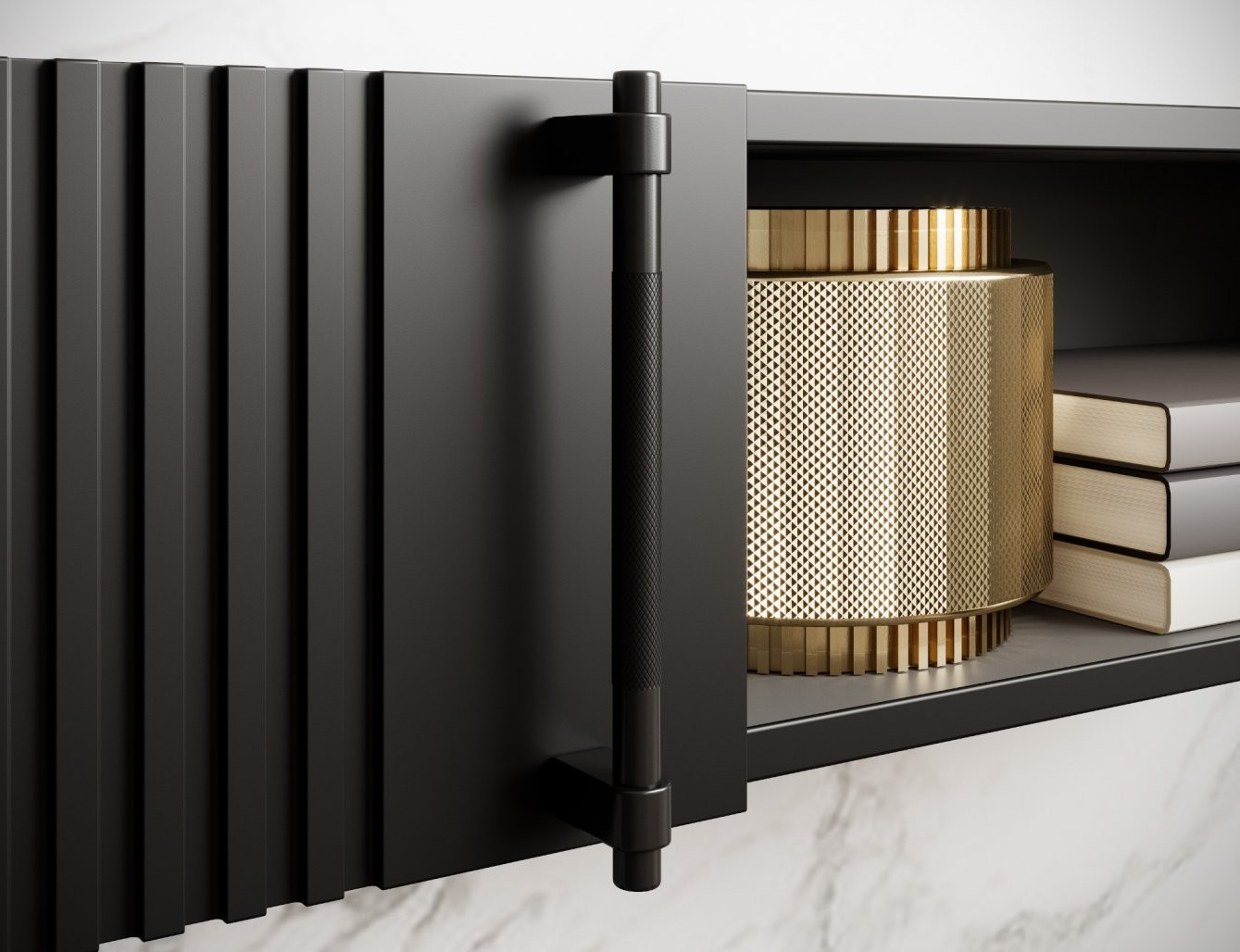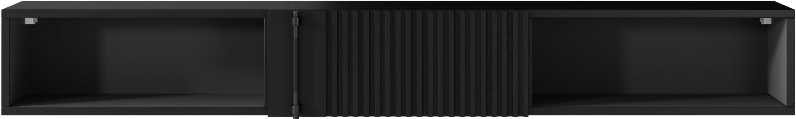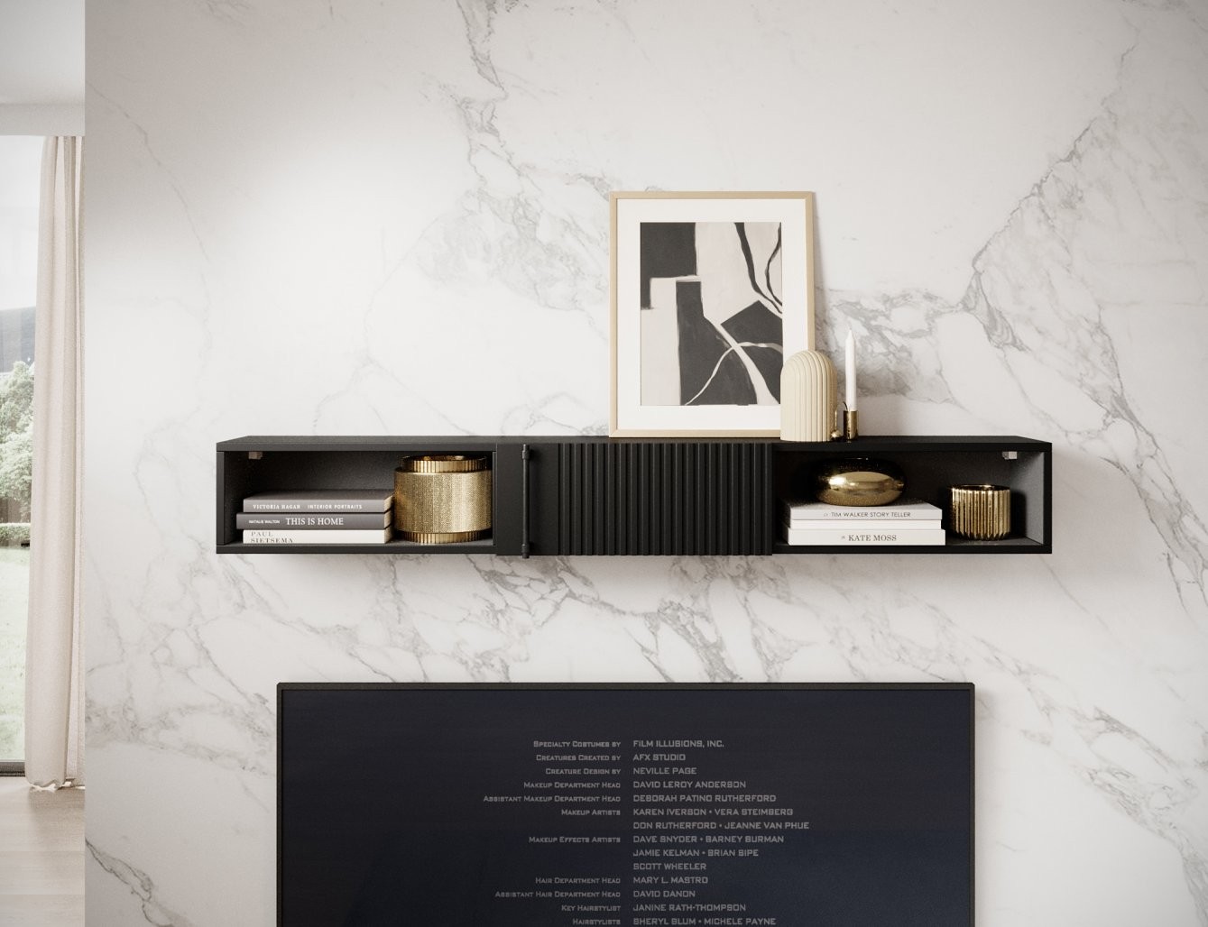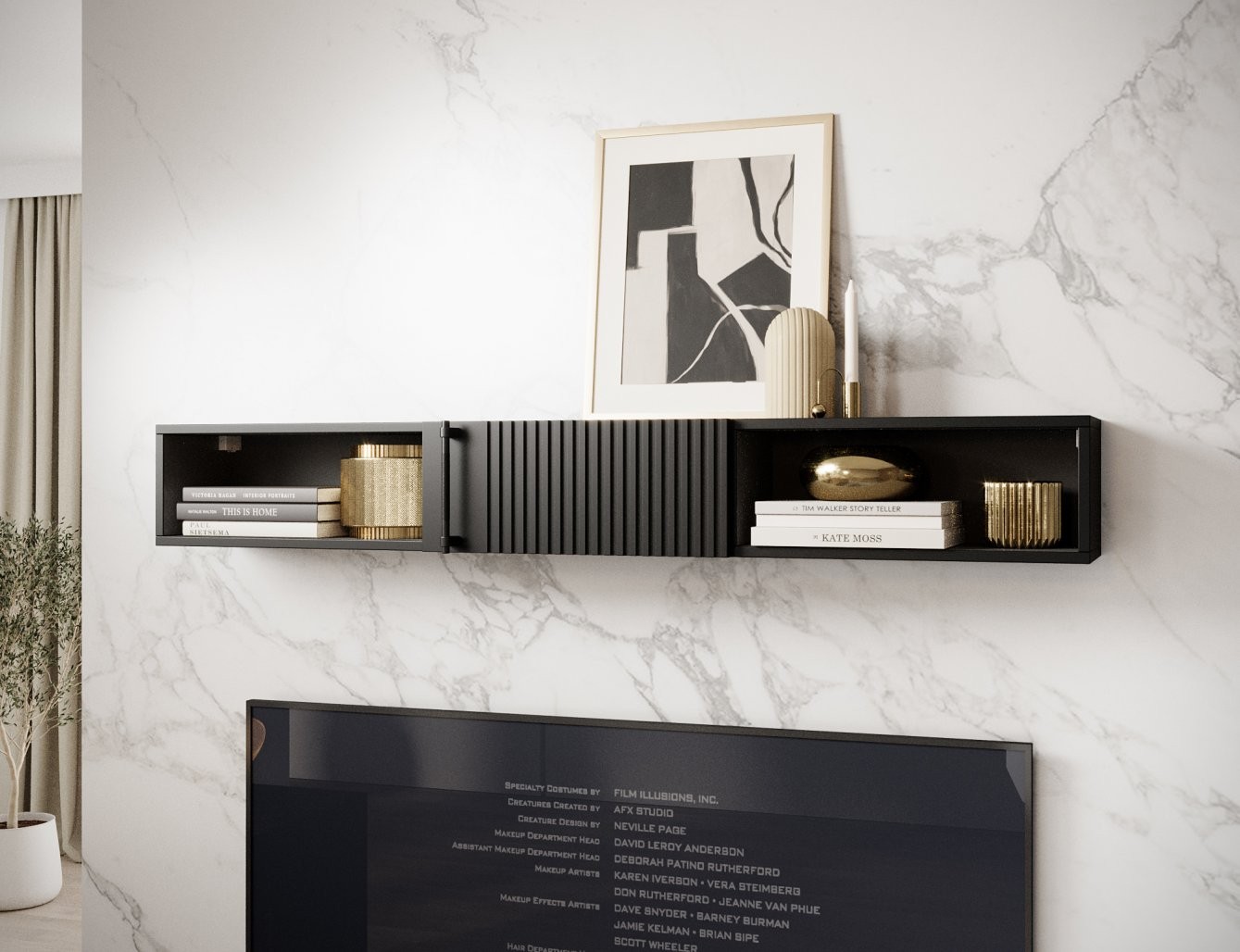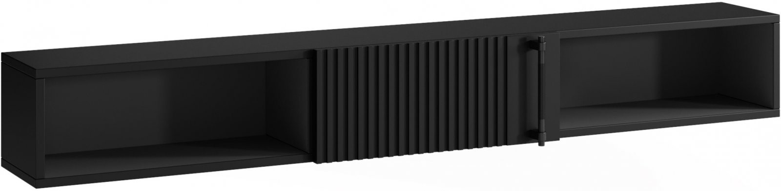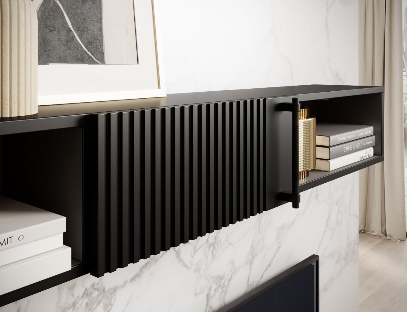 Izdelana je iz laminirane iverne plošče z žlebljeno sprednjo stranjo iz MDF, prevlečenega s folijo. Zaprti zgornji del police omogoča dodaten prostor za shranjevanje, kjer so vaše stvari zaščitene pred prahom. Premišljen dizajn vključuje tudi priročne detajle, kot so črni aluminijasti ročaji, ki poudarjajo industrijski značaj kosa.