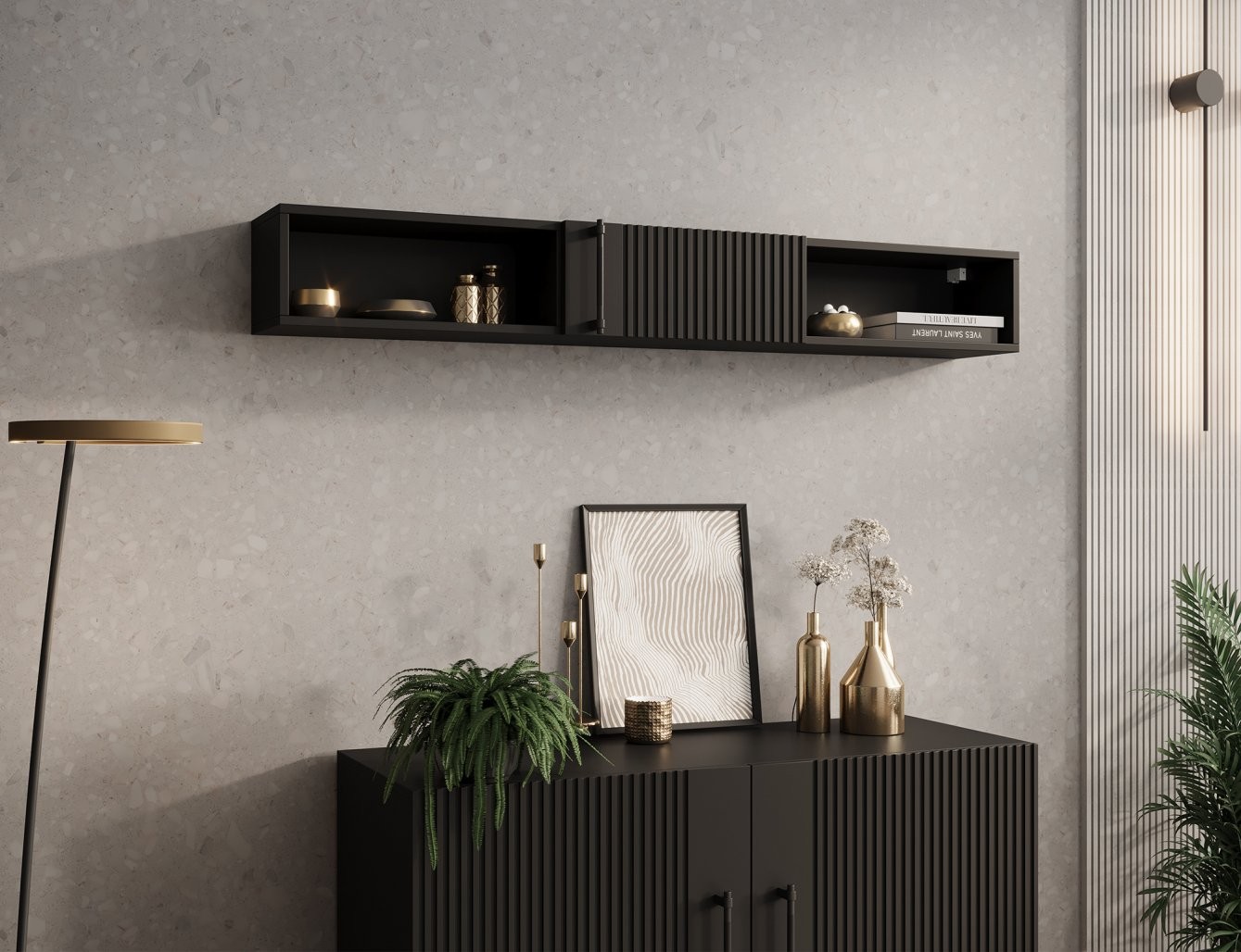 Stenska polica s pokrovom iz kolekcije Raftt je popolna kombinacija minimalističnega dizajna in praktičnega prostora za shranjevanje, idealna za moderne interierje. Ta elegantna polica prinaša surovo estetiko 'loft' stila v vaš dom, hkrati pa ponuja izjemno funkcionalnost, ki se poda v dnevne sobe, spalnice ali pisarne.