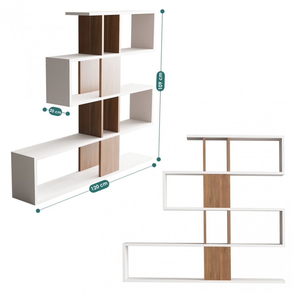 Knjižna polica je zasnovana v čudoviti kombinaciji bele in orehovih barv, kar ustvarja vizualno prijeten kontrast, ki vsakemu prostoru doda pridih elegance.