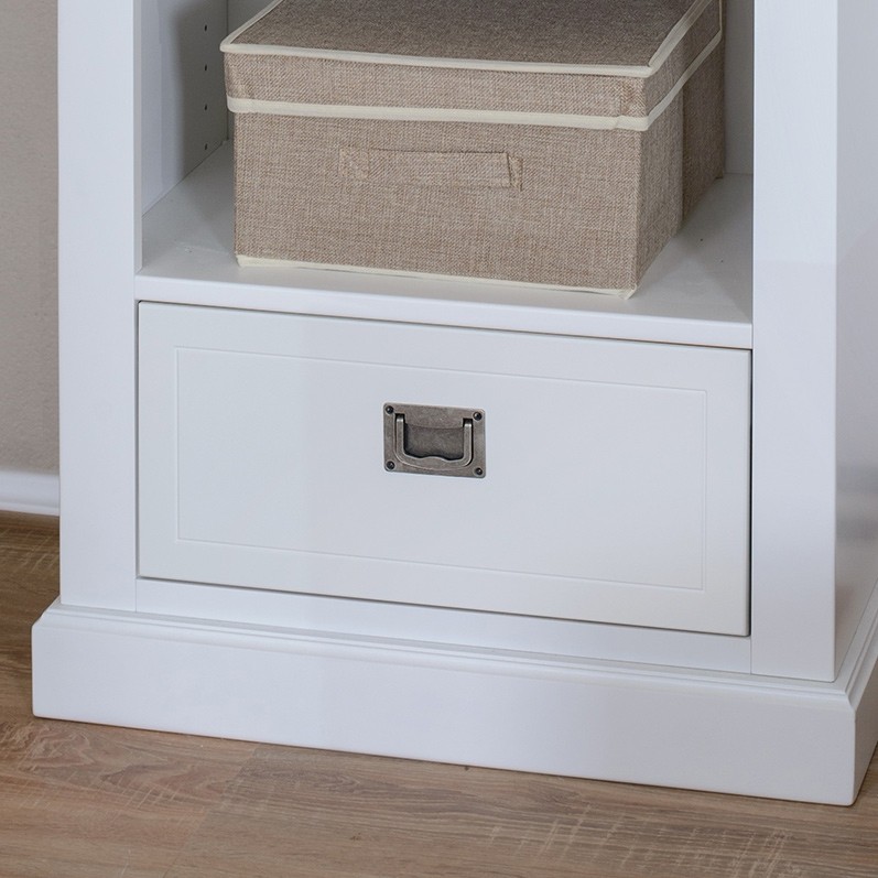 Sestavljen je iz štirih visokih polic in predala, v katerega lahko pospravite razne malenkosti, da bodo dobro organizirane in boste vedno vedeli kje se nahajajo.