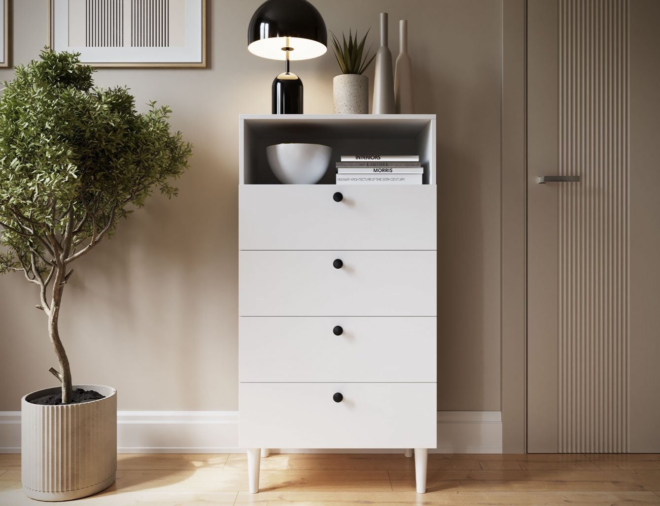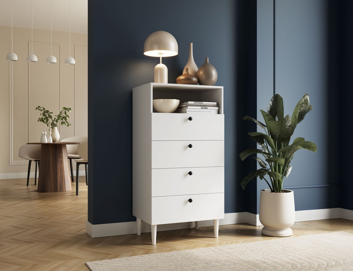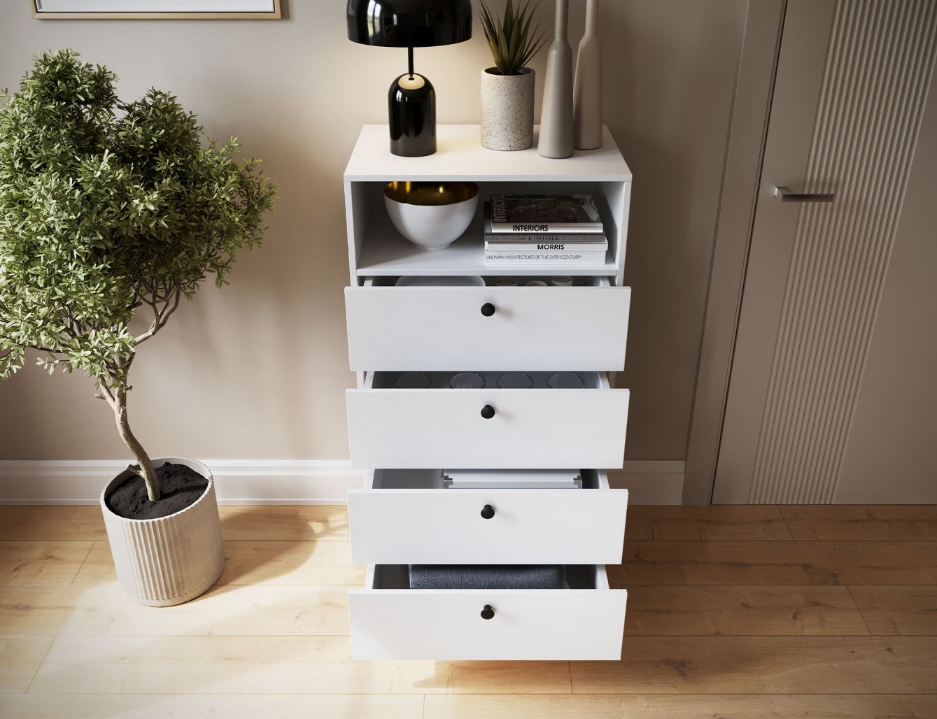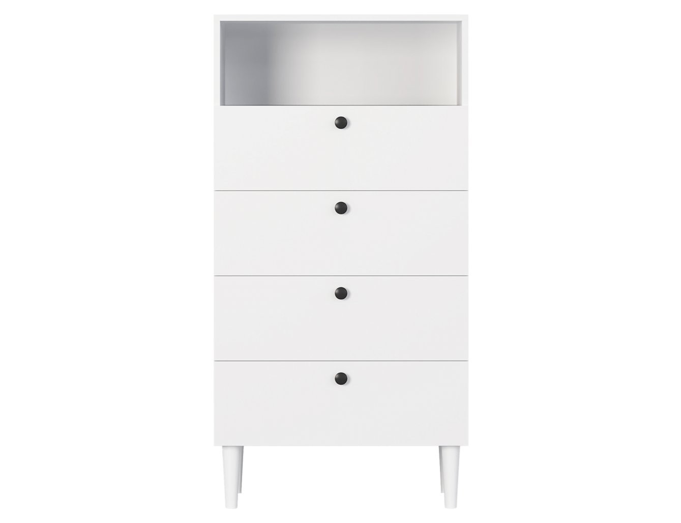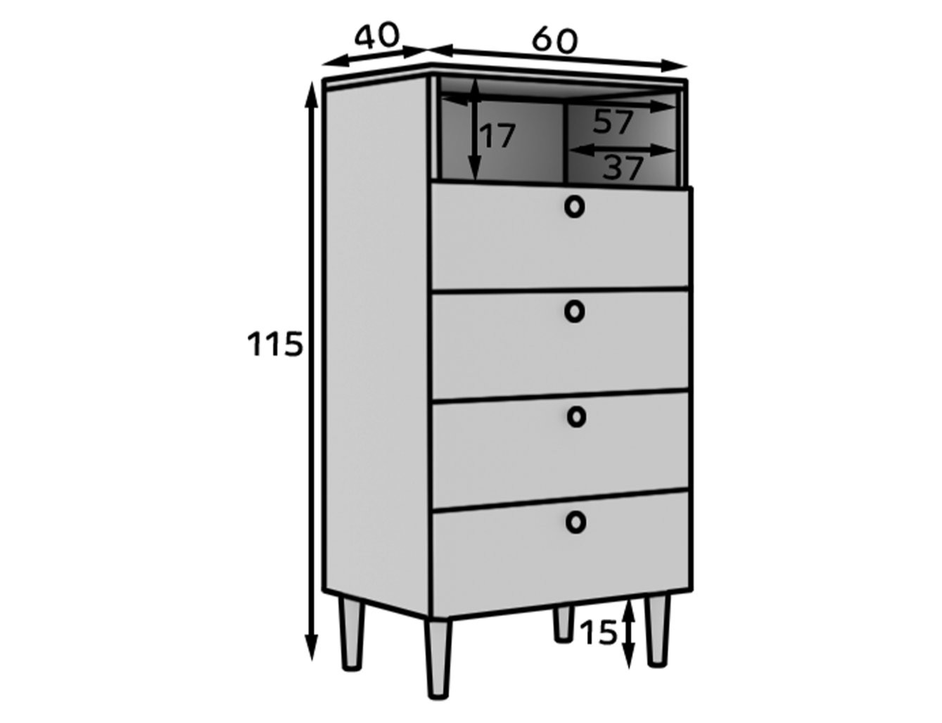 Ta funkcionalni regal ponuja veliko prostora za shranjevanje. Ima eno odprto polico, ki je idealna za razstavljanje dekorativnih predmetov, knjig ali pa za hiter dostop do pogosto uporabljanih stvari. Poleg tega so na voljo štirje prostorni predali, ki omogočajo urejeno shranjevanje raznovrstnih predmetov, s čimer ohranjate prostor urejen in čist. Vsak predal je zasnovan za maksimalno obremenitev 3 kg, kar zagotavlja stabilnost in trpežnost pohištva.