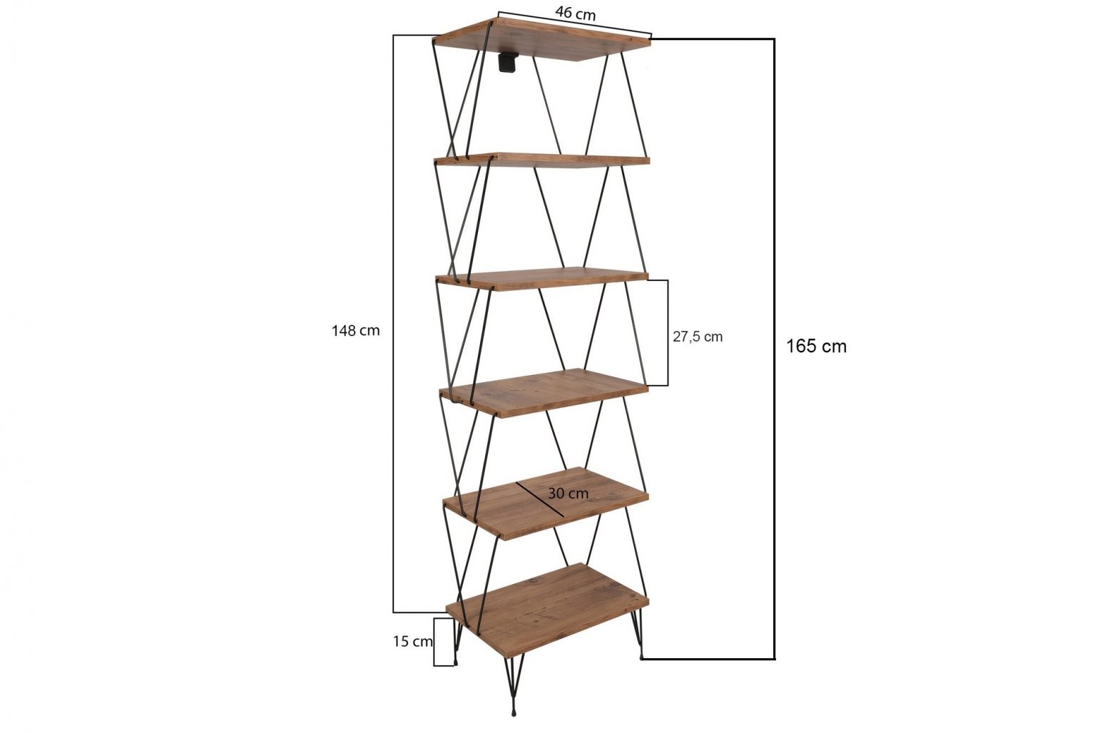 Ta knjižna polica ni le stilna, temveč tudi praktična. S debelino 18 mm in dimenzijami 46 cm v širino, 165 cm v višino in 30 cm v globino ponuja dovolj prostora za shranjevanje vseh vaših stvari. Višina police je 27,5 cm, višina nogic pa 15 cm, kar zagotavlja stabilnost in podporo, medtem ko možnost pritrditve na steno zagotavlja varnost in zaščito.
