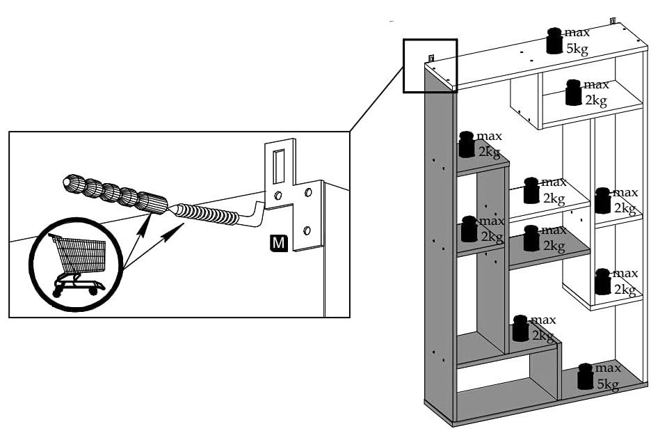 - Poličnik se lahko montira navpično ali vodoravno, na tla s kompletom črnih nožic ali celo direktno na steno