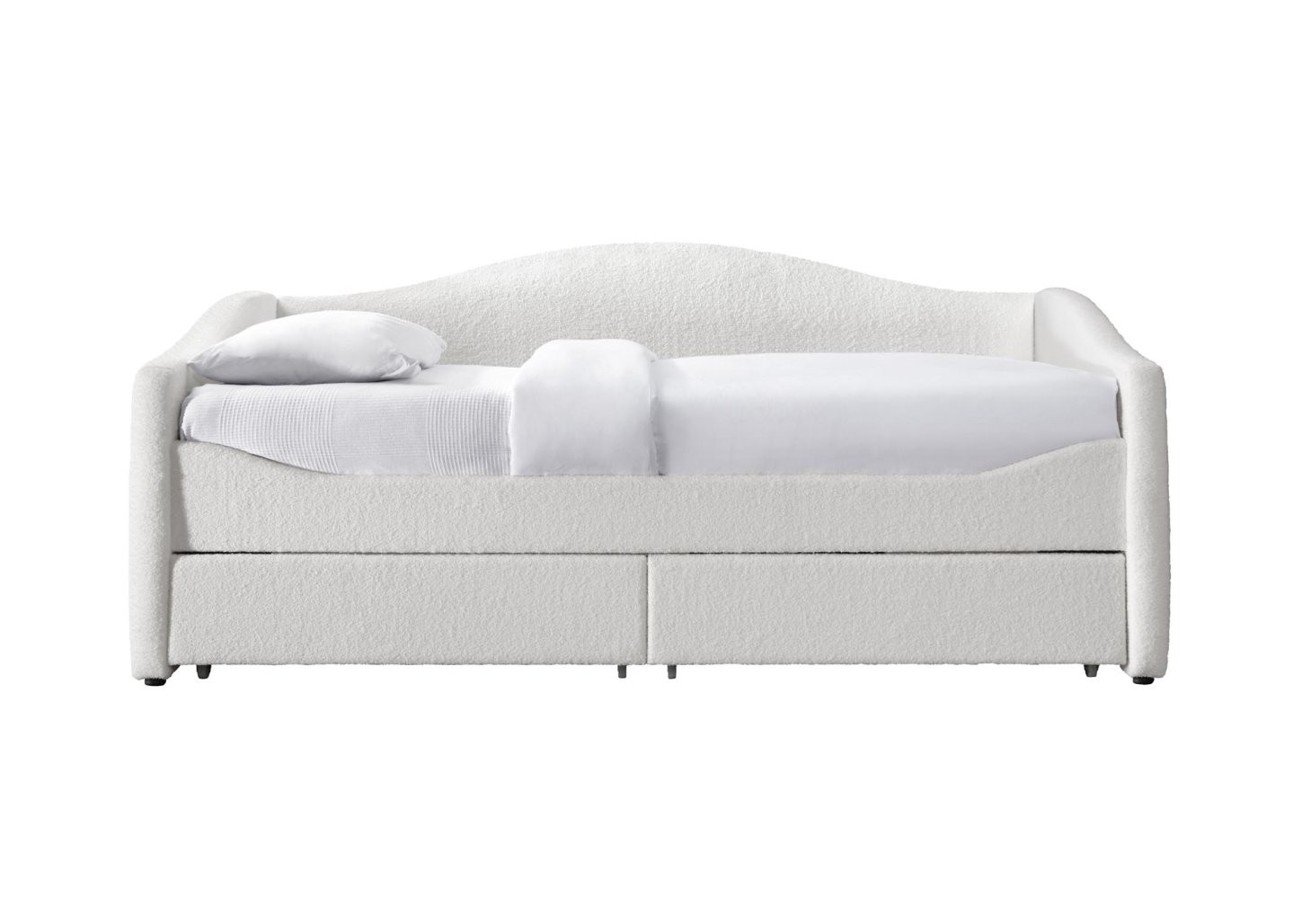 Postelja Almir je prostorna enojna postelja s predali za shranjevanje. Oblazinjena v mehkem bouclé blagu v kremni barvi.