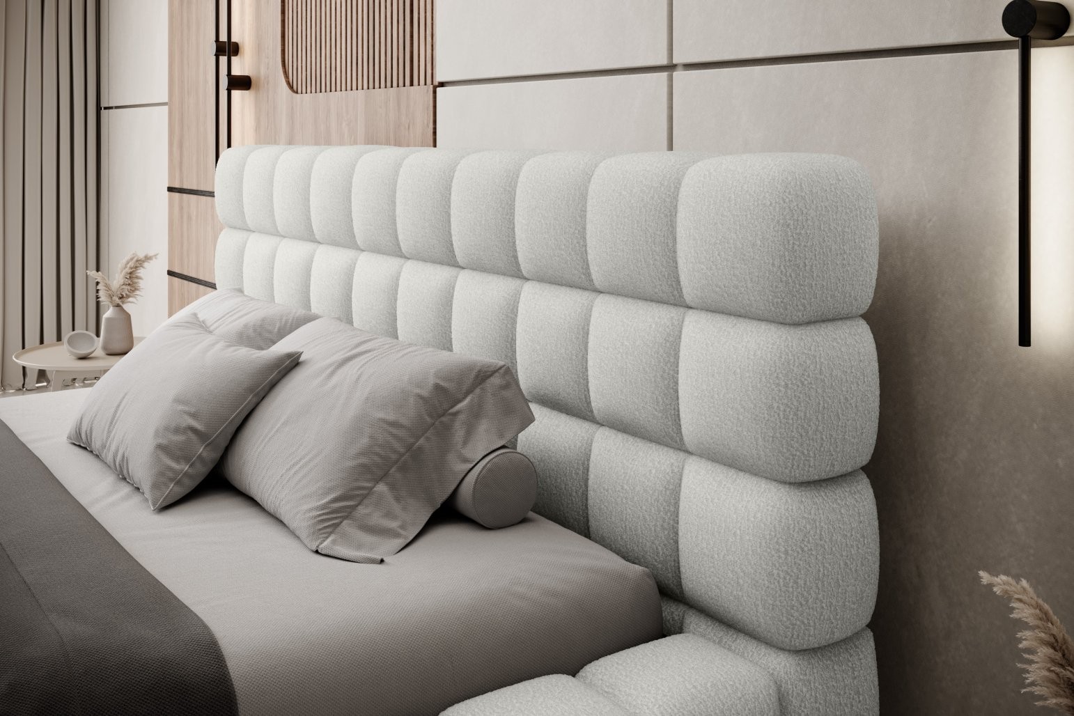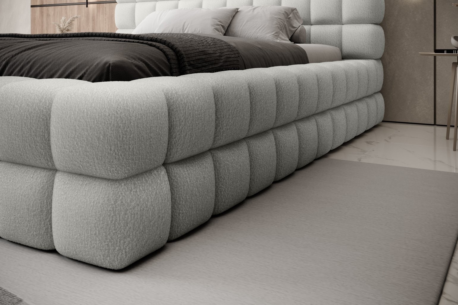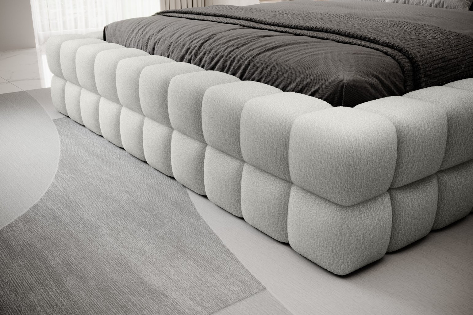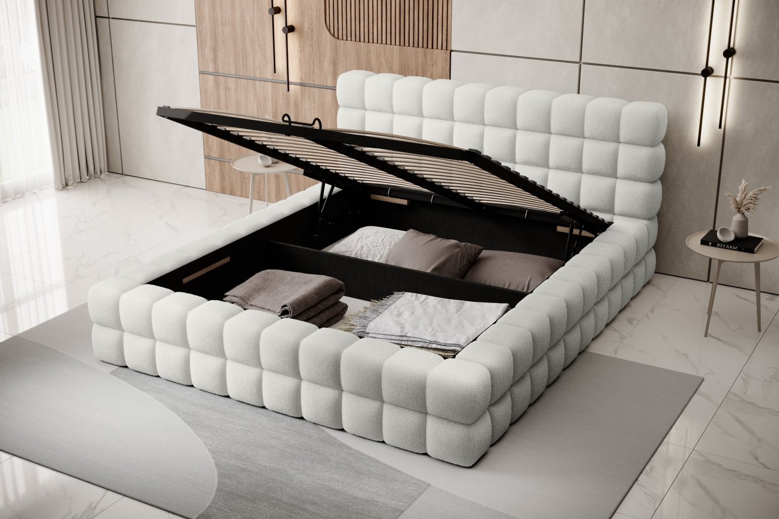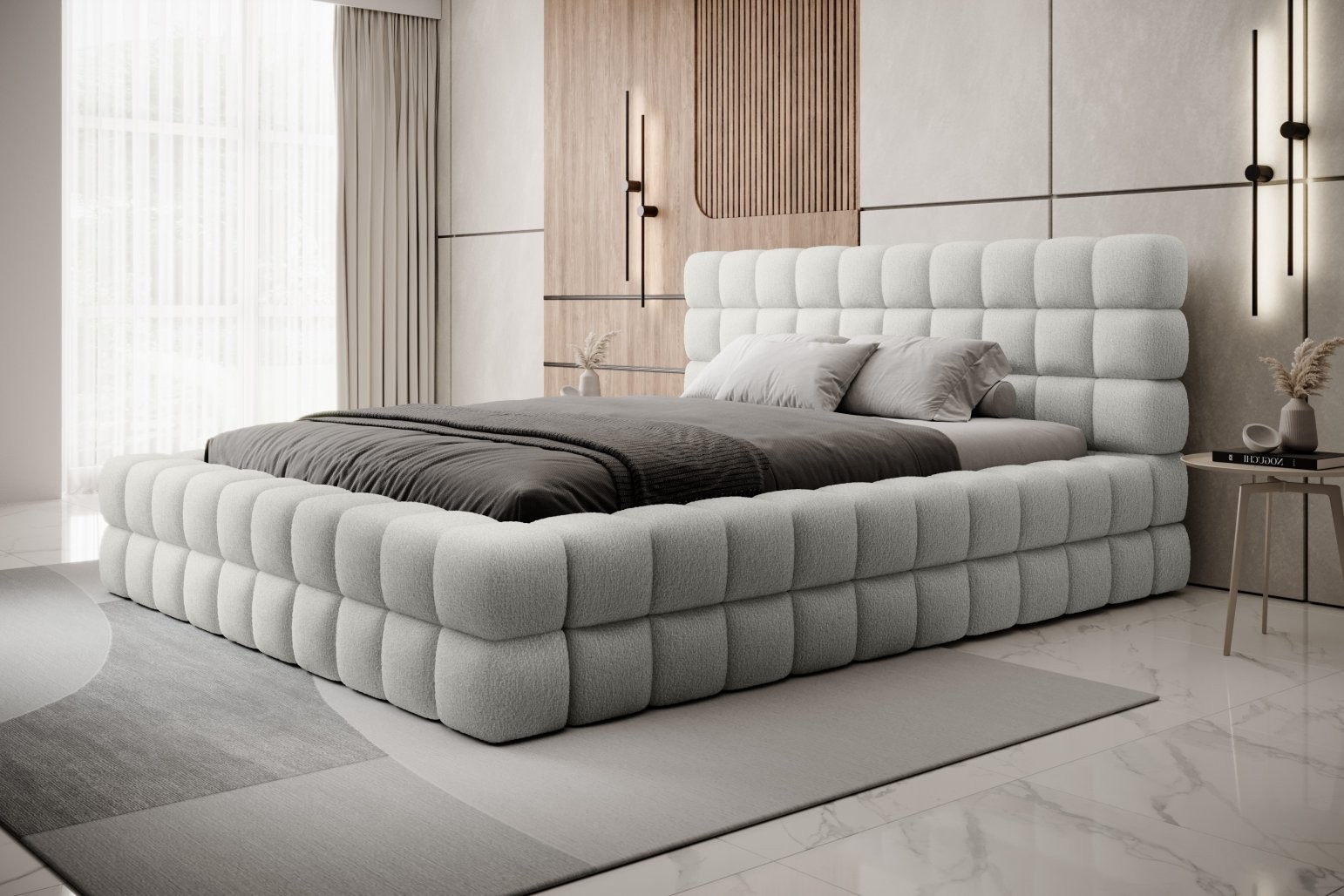 Višina sedišča je 42 cm; za doseganje popolnega udobja spanja ne pozabite dodati še višine vzmetnice. Izberete lahko tudi med različnimi dimenzijami vzmetnice in številnimi barvami oblazinjenja, kar vam omogoča, da posteljo popolnoma prilagodite svojemu okusu in notranjosti.
