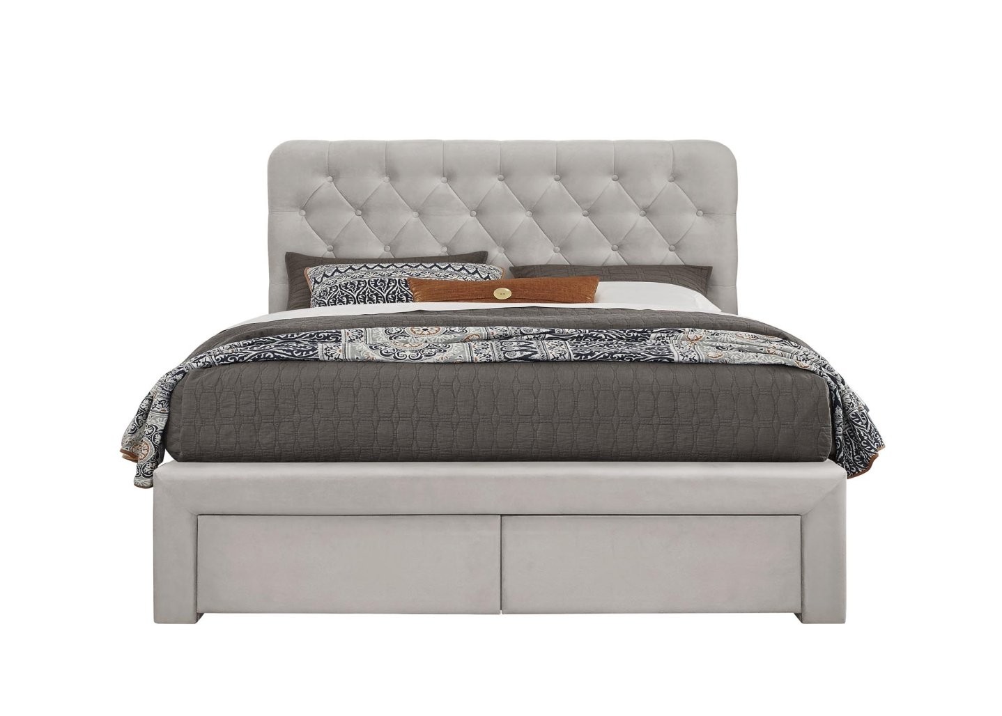 Postelja Elor, oblazinjena v žametnem materialu, z dvema prostornima predaloma in elegantnim prestižnem slogom. Na voljo v več barvah.