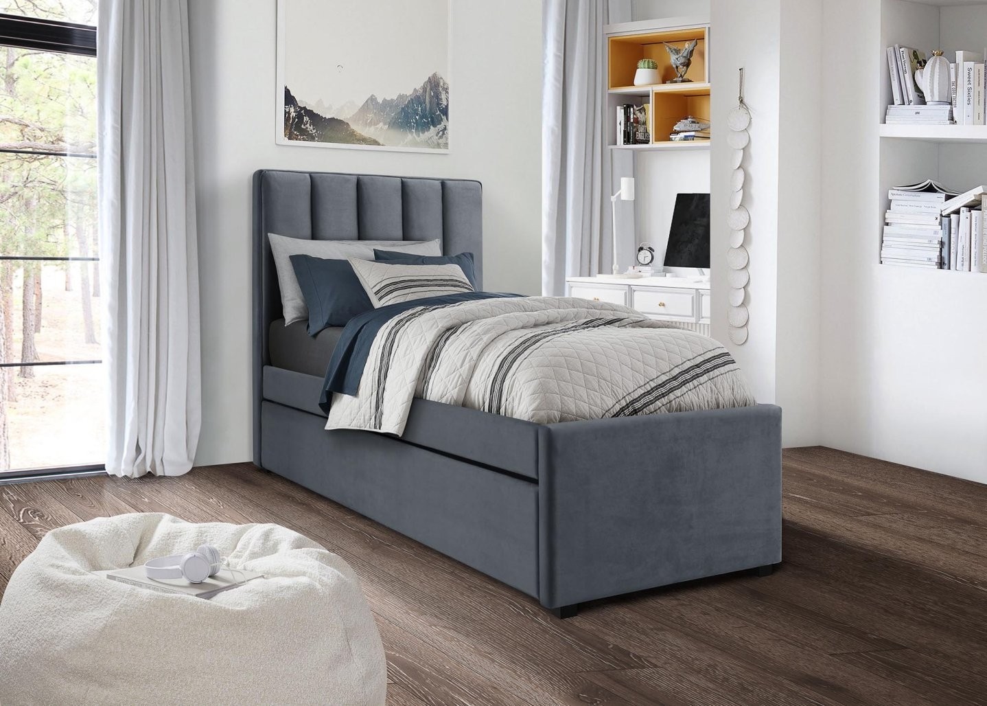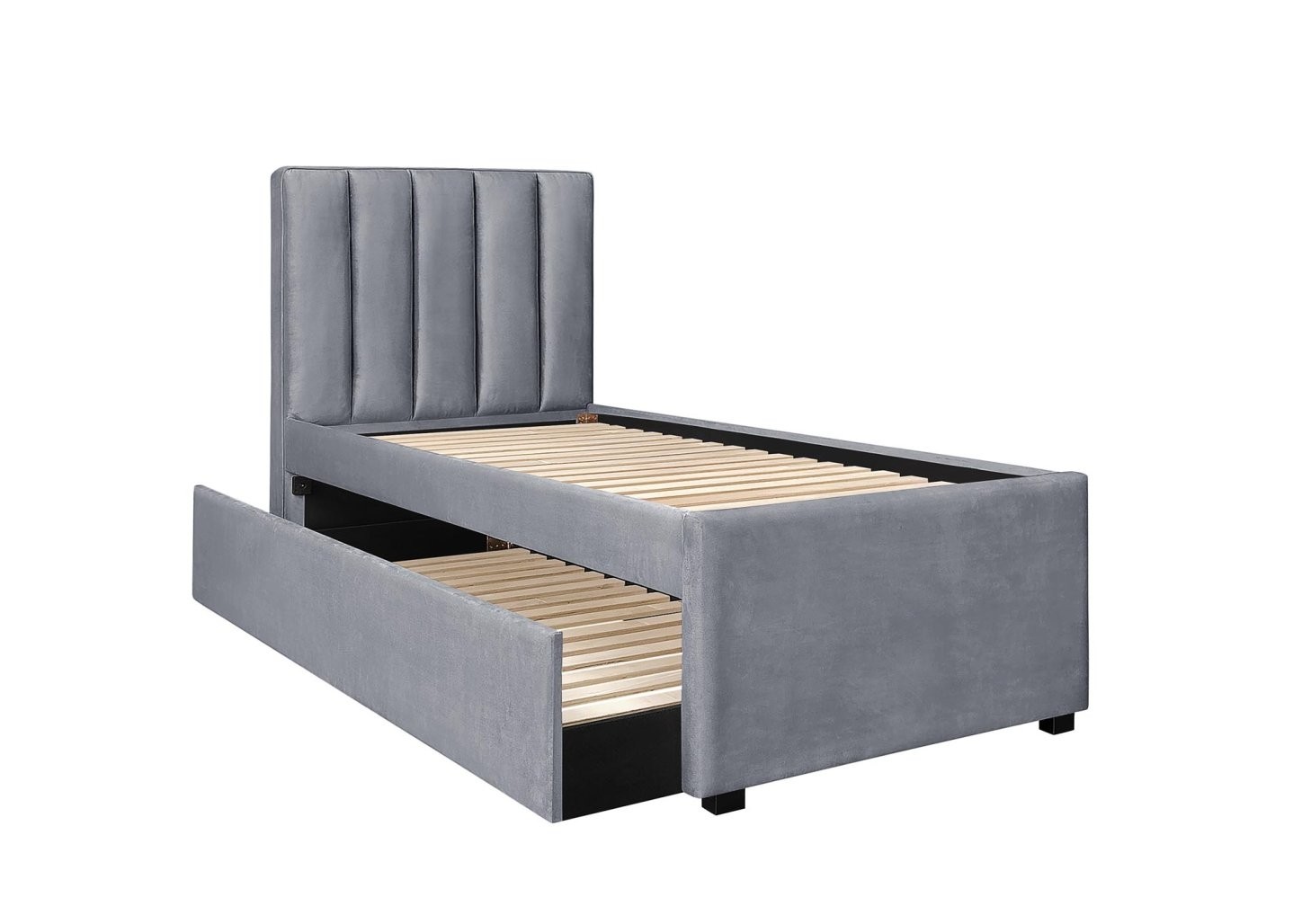 Postelja Helron v nežno žametnem oblazinjenju, primerna za enojno vzmetnico. Vključuje spodnji izvlečni del, na voljo v več barvah, idealna za sodobne najstniške sobe.