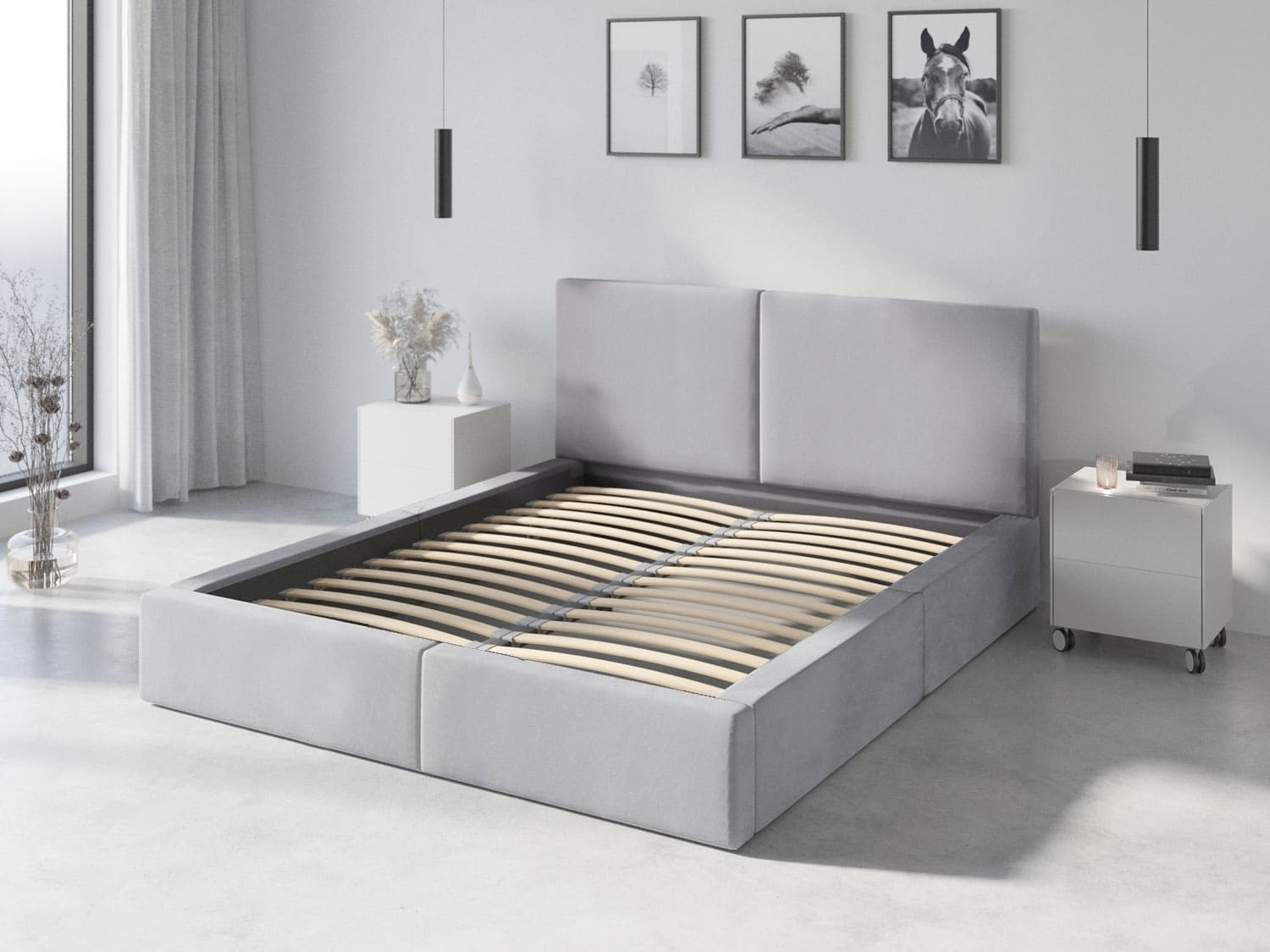 Postelja HILTON 140x200 CM je modernega izgleda in na voljo v različnih barvah. Postelja je oblazinjena v trpežno, kvalitetno in prijetno tkanino. Posteljni pod je vključen v ceno, medtem ko ležišče ni vključeno v ceno. Kovinsko ogrodje je nameščeno na dveh kovinskih vzmetnih mehanizmih, sestavljenih iz 30 močnih letvic, nameščenih na kovinski konstrukciji. Največja nosilnost ogrodja je 400 kg