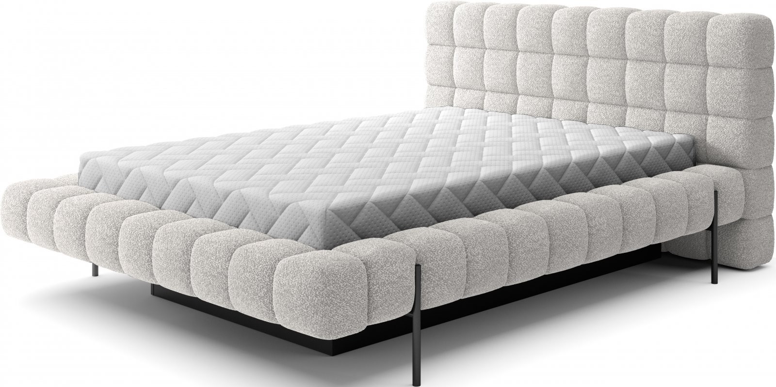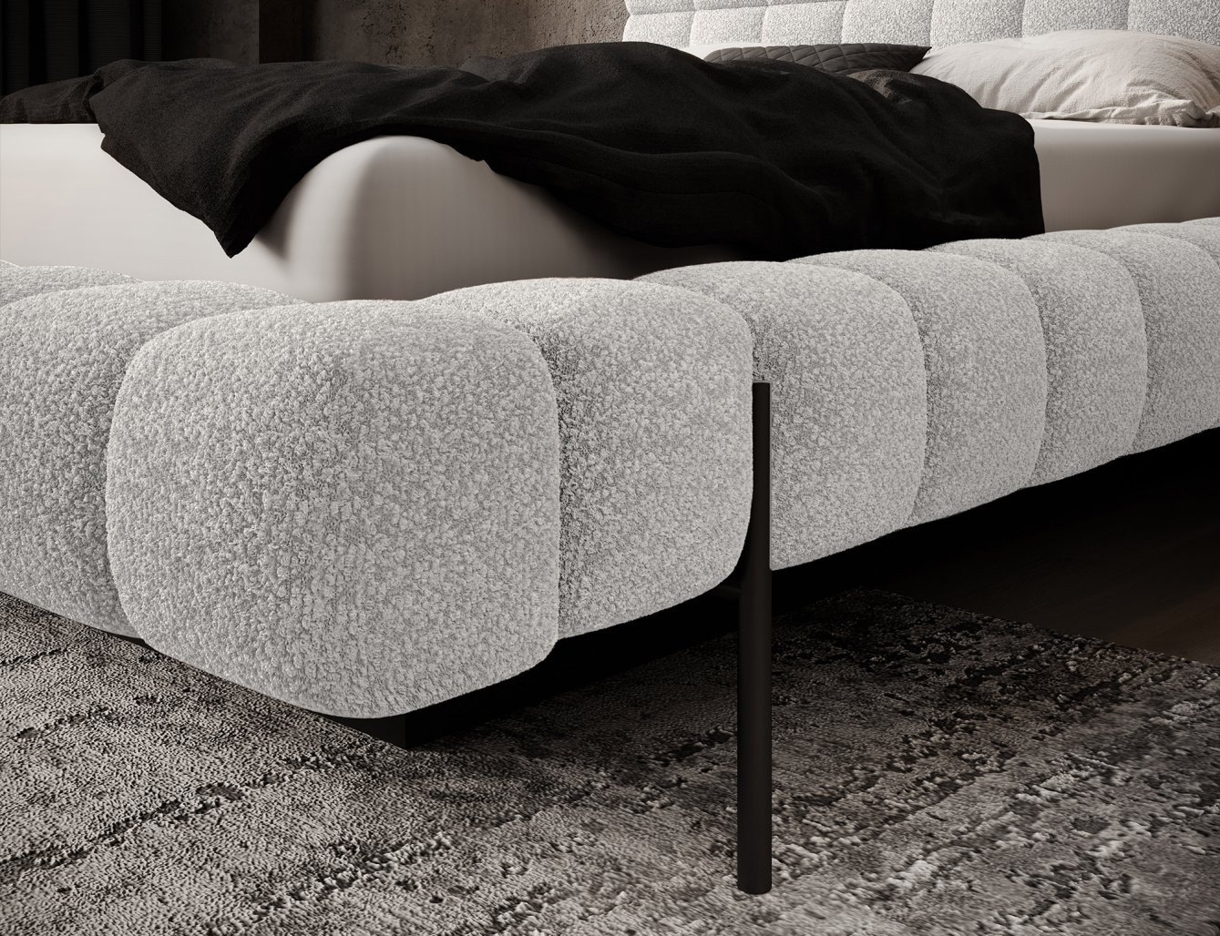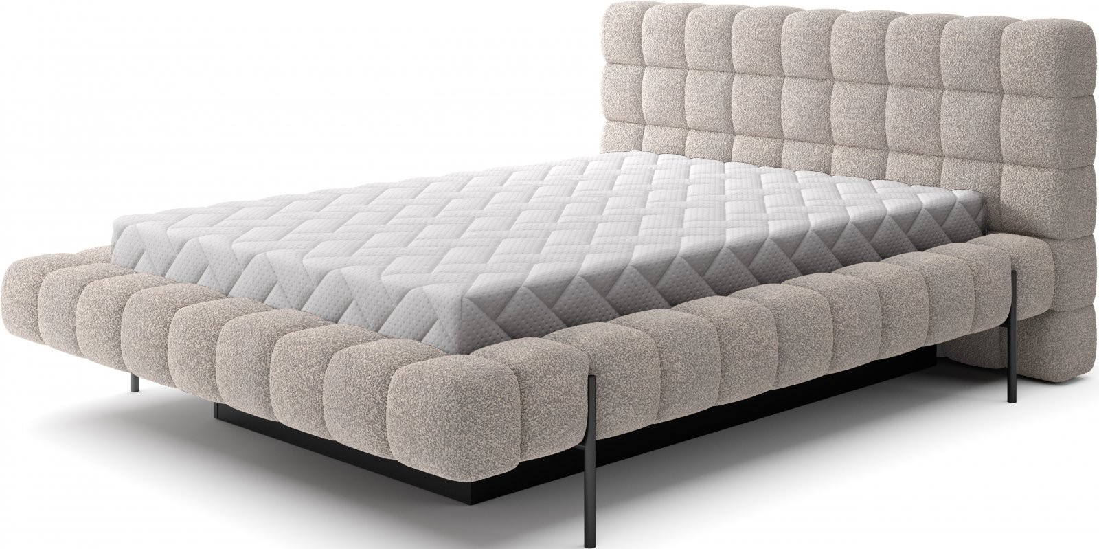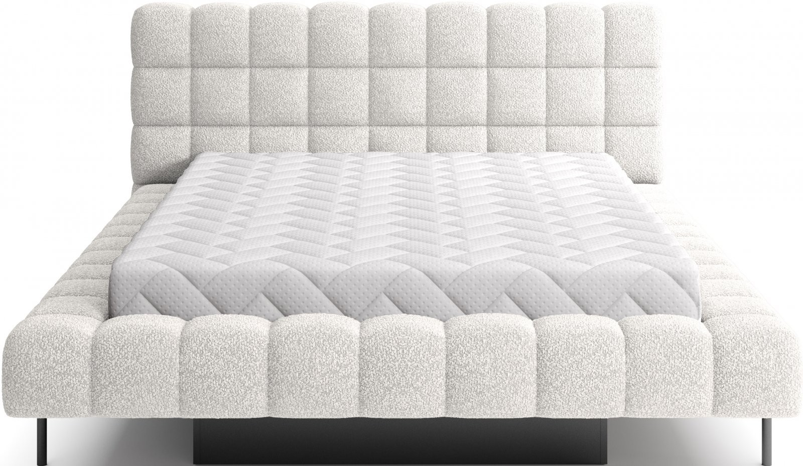 Postelja je na voljo v treh dimenzijah ležišča: 140 cm, 160 cm in 180 cm, kar omogoča prilagoditev različnim prostorom in osebnim željam. Kovinski okvir vključuje 36 letvic, ki enakomerno porazdelijo težo ležišča, s čimer se poveča vzdržljivost in zagotavlja vrhunska podpora. Črna kovinska noga zagotavlja stabilno podlago, hkrati pa poudarja eleganten, minimalističen dizajn.