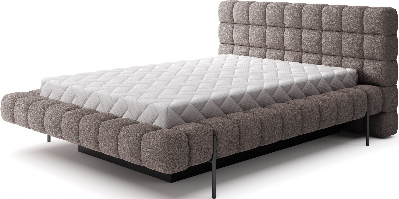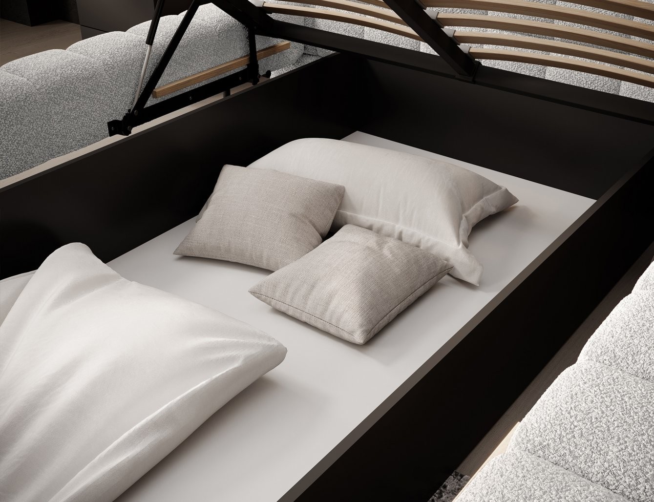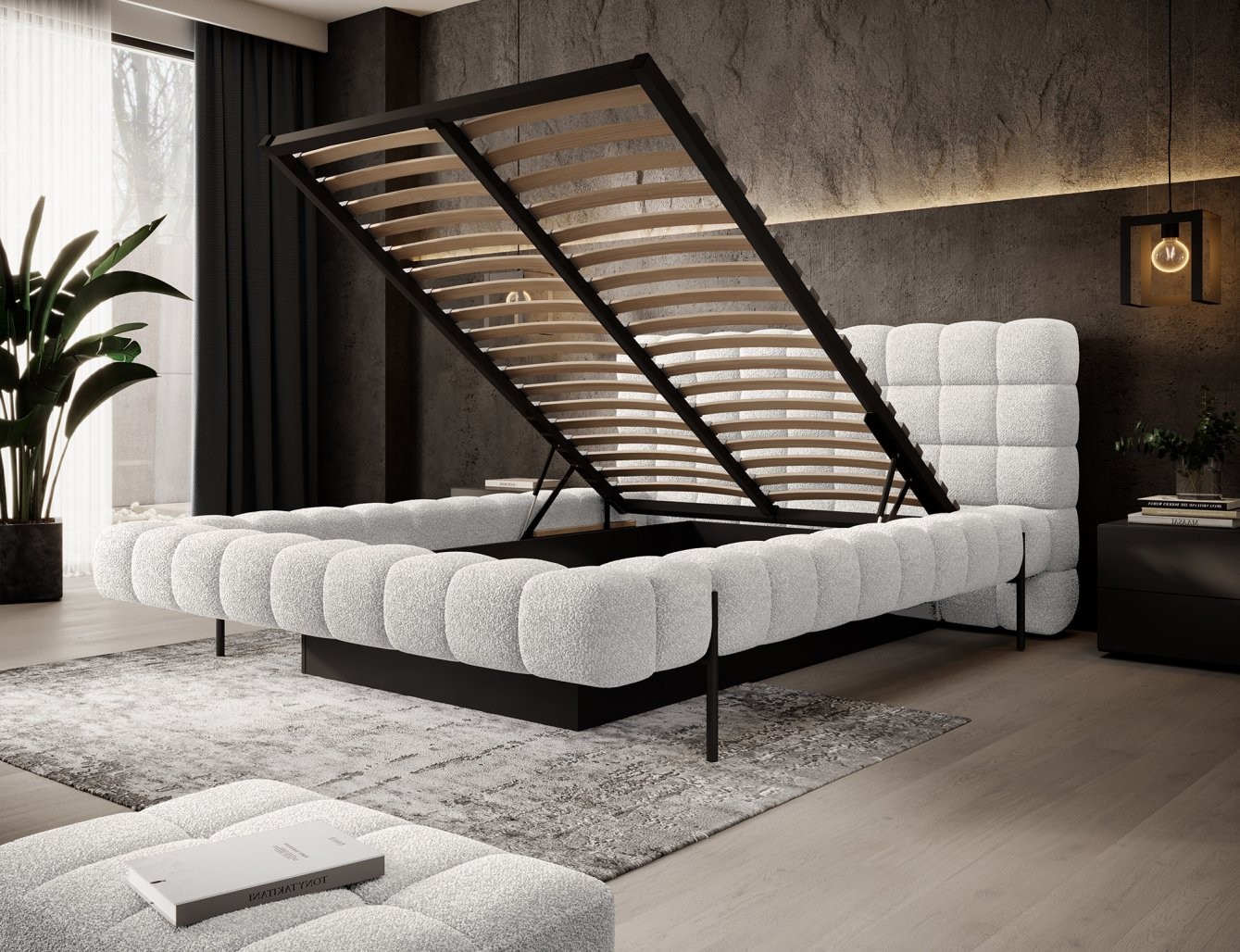 Postelja je na voljo v treh dimenzijah ležišča: 140 cm, 160 cm in 180 cm, kar omogoča prilagoditev različnim prostorom in osebnim željam. Kovinski okvir vključuje 36 letvic, ki enakomerno porazdelijo težo ležišča, s čimer se poveča vzdržljivost in zagotavlja vrhunska podpora. Črna kovinska noga zagotavlja stabilno podlago, hkrati pa poudarja eleganten, minimalističen dizajn.