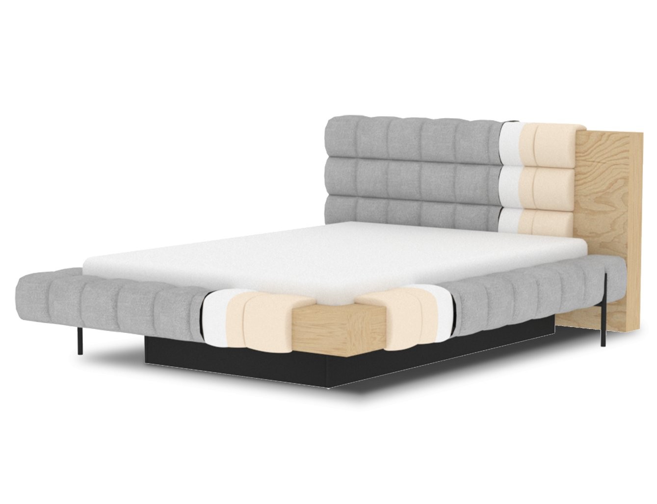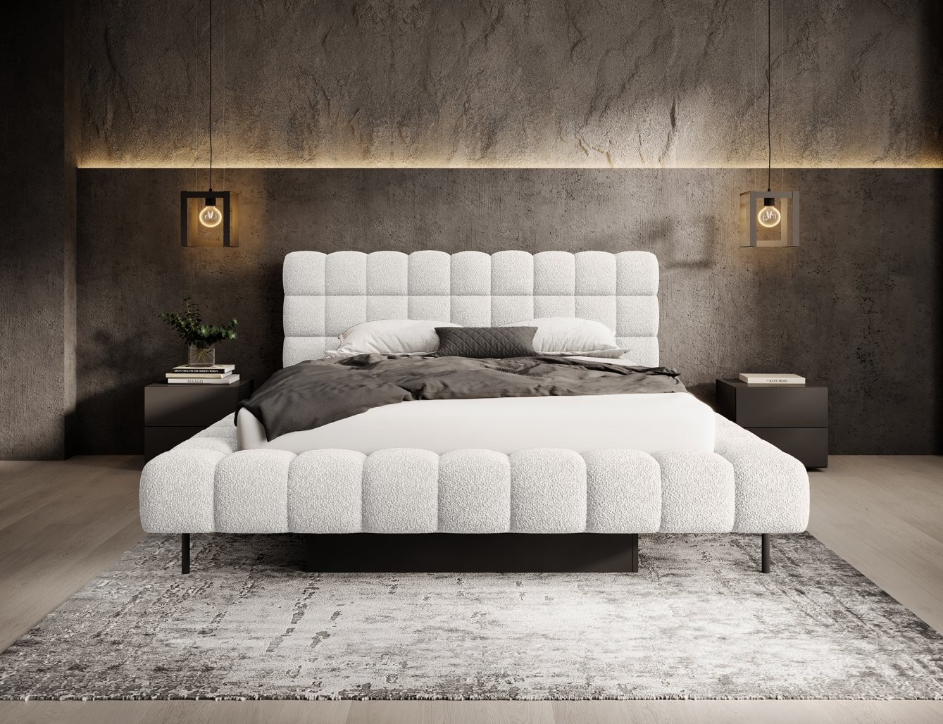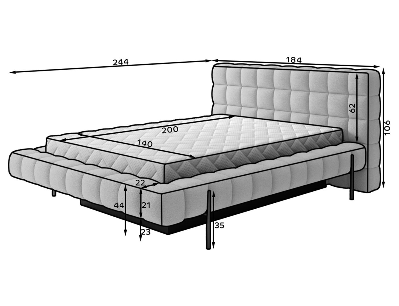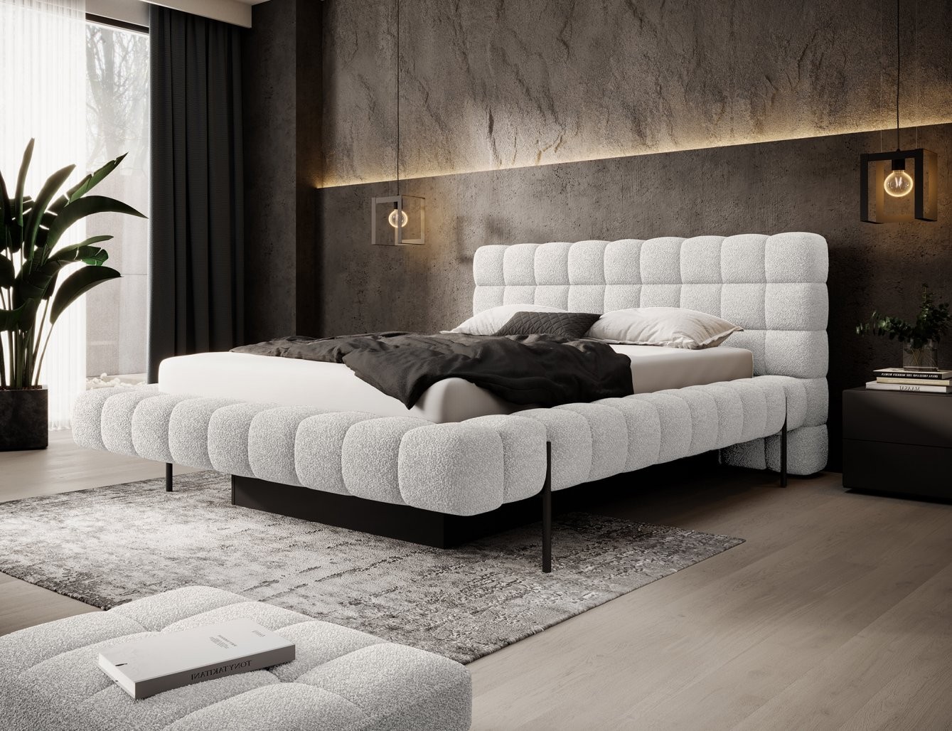 Postelja je na voljo v treh dimenzijah ležišča: 140 cm, 160 cm in 180 cm, kar omogoča prilagoditev različnim prostorom in osebnim željam. Kovinski okvir vključuje 36 letvic, ki enakomerno porazdelijo težo ležišča, s čimer se poveča vzdržljivost in zagotavlja vrhunska podpora. Črna kovinska noga zagotavlja stabilno podlago, hkrati pa poudarja eleganten, minimalističen dizajn.