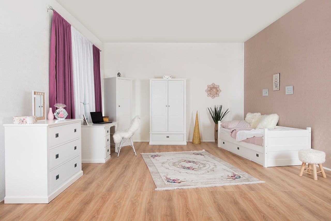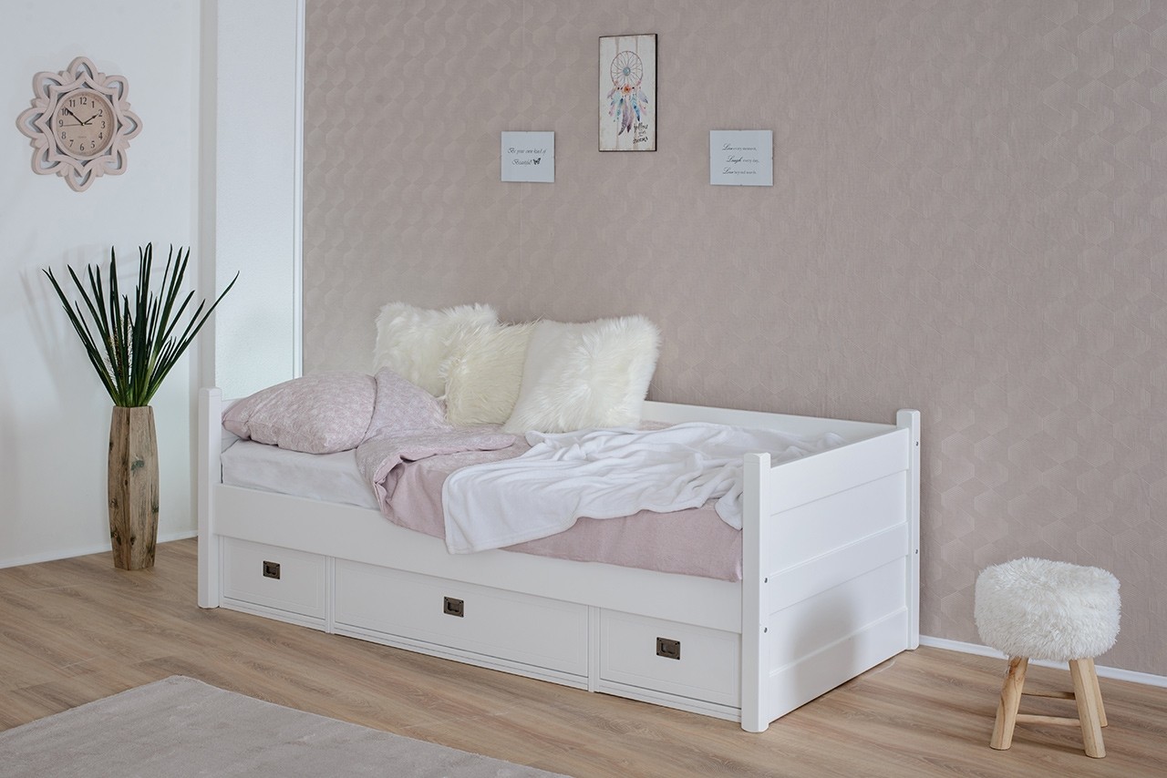 Privoščite svojemu otroku kvaliteten in varen spanec na masivni postelji MARJETICA, ki je izdelana iz kombinacije masivne bukve in kvalitetnega mediapana. Na voljo je v elegantni beli barvi, ki se odlično poda v vsako sobico. Spodaj ima tri prostorne predale v katere lahko pospravite posteljnino, razne igrače in ostale poljubne predmete in tako ohranite vedno čisto in pospravljeno sobico! Predali imajo funkcijo tihega zapiranja, ki omogoča lažjo vsakodnevno uporabo ter prepreči nastajanje prask in poškodb.