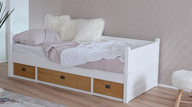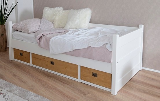 Privoščite svojemu otroku kvaliteten in varen spanec na masivni postelji MARJETICA, ki je izdelana iz kombinacije masivne bukve in kvalitetnega mediapana. Na voljo je v elegantni beli barvi, ki se odlično poda v vsako sobico. Spodaj ima tri prostorne predale v katere lahko pospravite posteljnino, razne igrače in ostale poljubne predmete in tako ohranite vedno čisto in pospravljeno sobico! Predali imajo funkcijo tihega zapiranja, ki omogoča lažjo vsakodnevno uporabo ter prepreči nastajanje prask in poškodb.