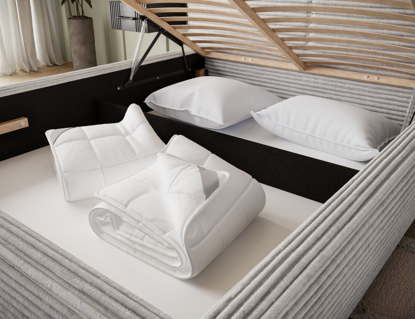Ena ključnih prednosti postelje Pesillo je praktičen prostor za shranjevanje posteljnine. Ta funkcija omogoča učinkovito izrabo prostora in enostavno organizacijo, kar je še posebej koristno v manjših spalnicah. S svojim modernim stilom se postelja popolnoma ujema s trenutnimi trendi notranjega oblikovanja, ustvarjajoč idealno okolje za sprostitev.