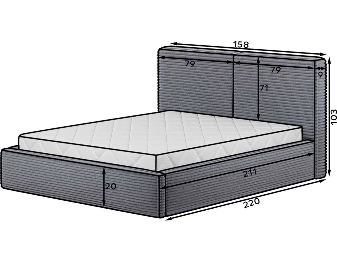 Poleg sodobnega videza ponuja postelja Pesillo izjemno udobje in praktičnost. Polnilo iz pene T2130 zagotavlja trajnost in udobje med spanjem. Višina postelje je 103 cm, globina pa 220 cm. Širina se spreminja glede na izbrano dimenzijo ležišča in znaša 158 cm, 178 cm ali 198 cm. Robustne črne plastične noge zagotavljajo stabilnost in dodajo prefinjen zaključek celotnemu videzu.