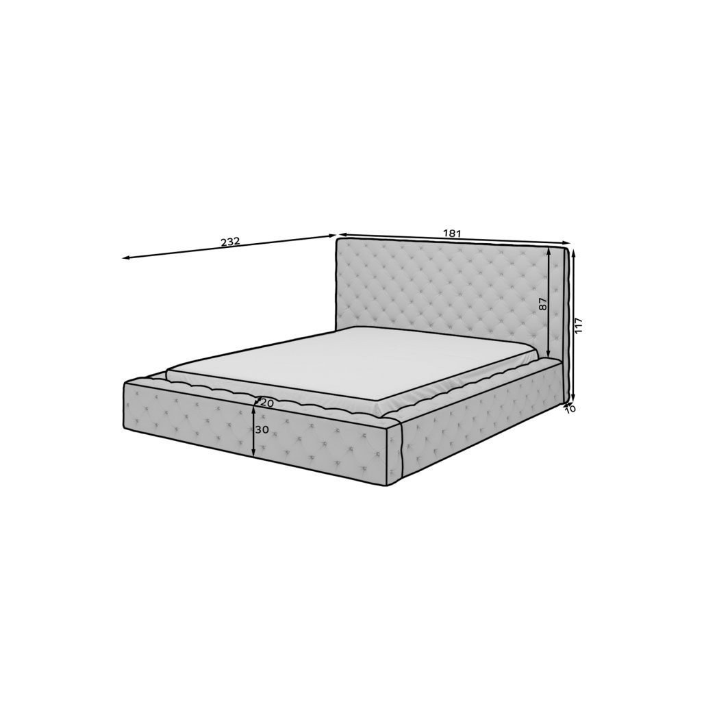 Postelja Princce je odlična kombinacija stila, funkcionalnosti in udobja. Dodatno jo lahko okrasite z dekorativnim prešitjem, ki ji doda eleganco in edinstven značaj. Z dolžino 232 cm in višino 117 cm predstavlja impresiven dodatek k vašemu prostoru.