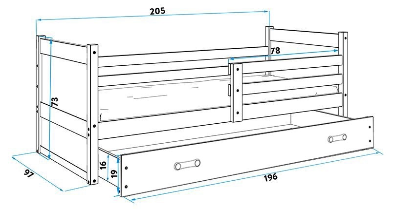Otroška postelja RICO s predalom je več kot samo udobna in varna za spanje vašega otroka, saj edinstven dizajn postelje oživi celotno otroško sobico, kjer bo vaš otrok z veseljem prebival v času igre, učenja in izpolnitvi malih otroških sanj. Poleg postelje dobite tudi posteljni pod in ležišče!