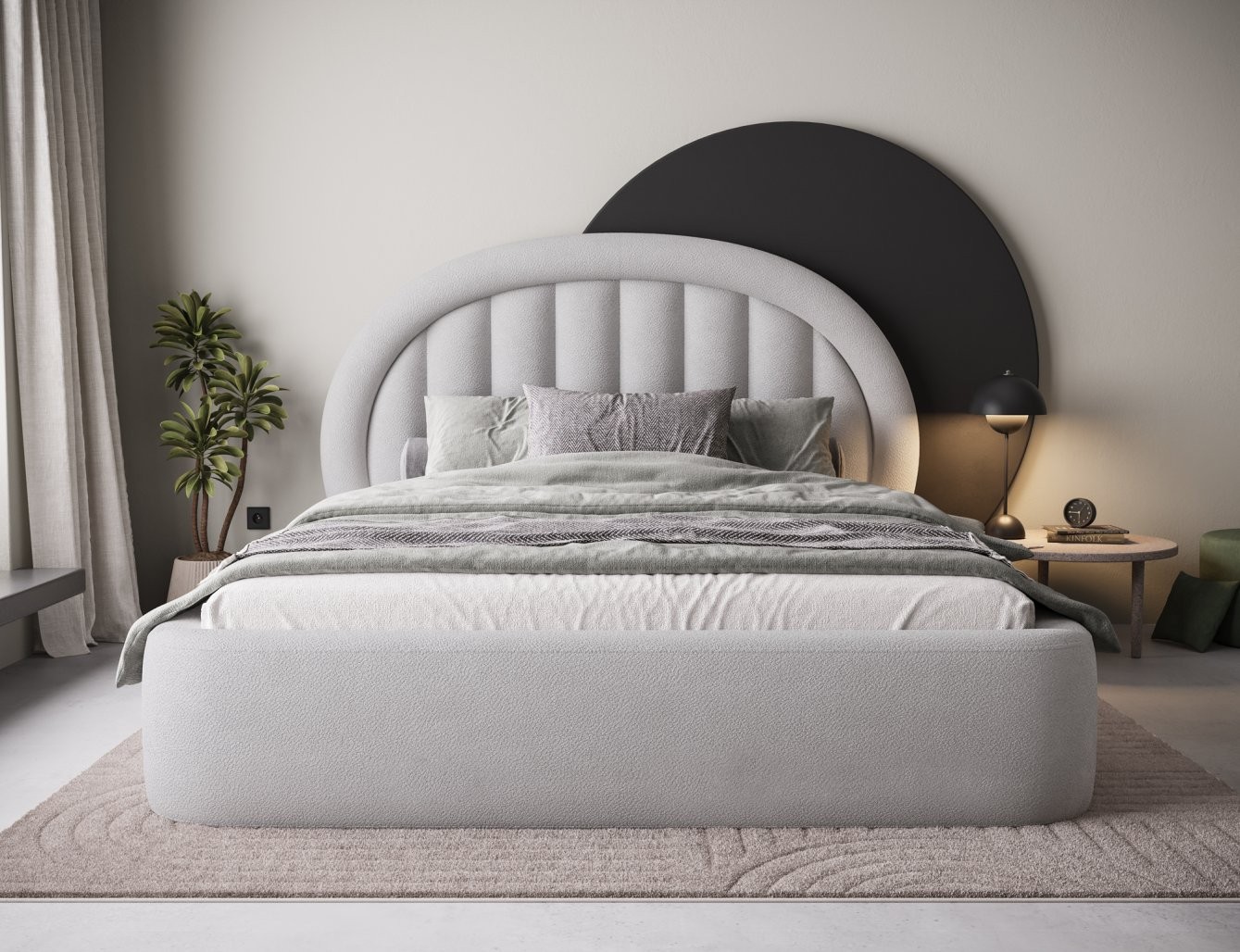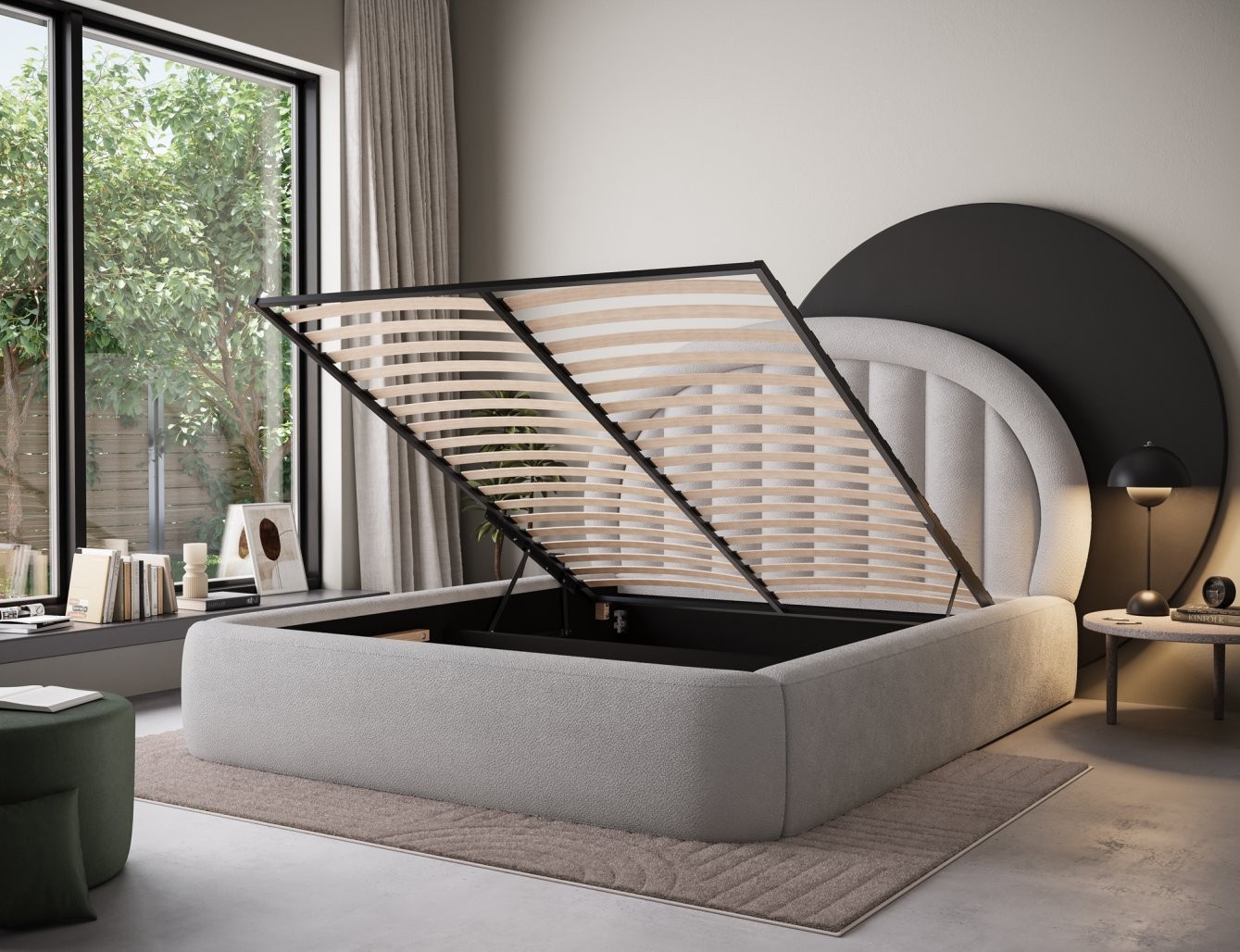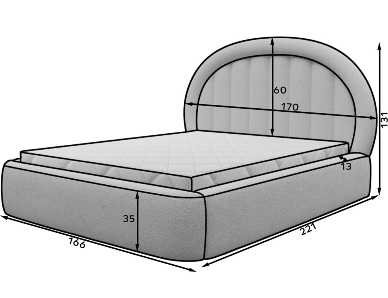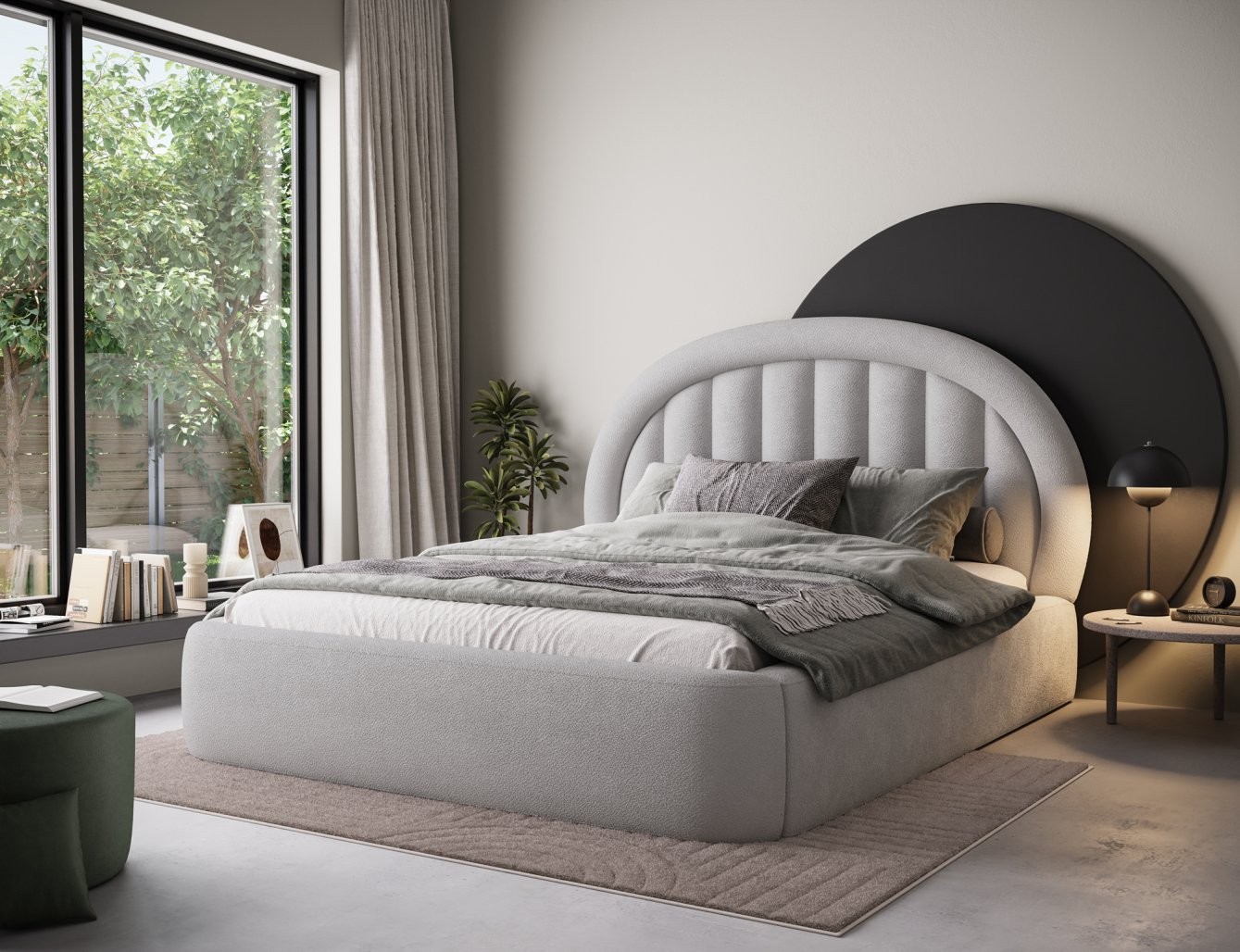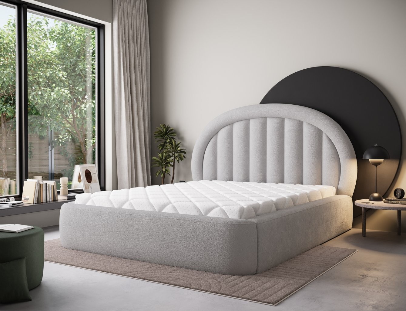 Konstrukcija postelje je premišljeno zasnovana. Polnilo iz visoko kakovostne poliuretanske pene T2130 zagotavlja optimalno podporo telesu in izjemno udobje. Skupna višina postelje je 131 cm, globina pa 221 cm, kar konstrukciji daje eleganten in dobro uravnotežen videz. Stabilne črne plastične noge dodajajo lahkotnost in sodoben pridih.