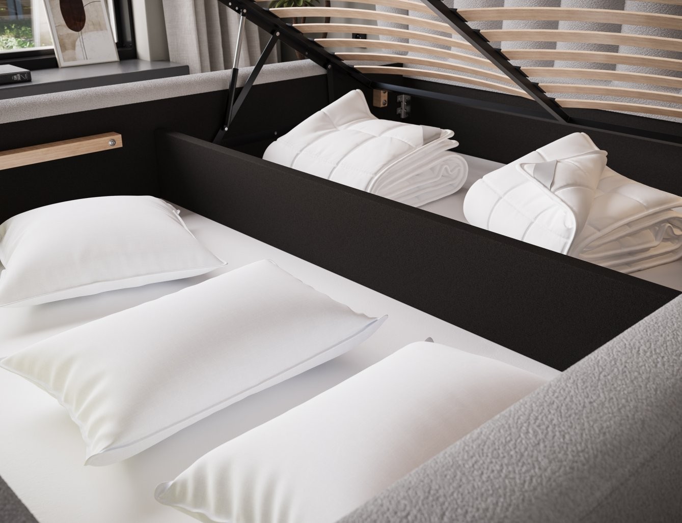 Tapedo postelja je tudi izjemno praktična, saj je opremljena s priročnim prostorom za shranjevanje posteljnine, kar olajša ohranjanje reda v spalnici. Zahvaljujoč svoji trdni izdelavi, funkcionalnim lastnostim in estetski obliki, bo postelja Tapedo odličen dodatek k vašemu domu, saj ustvarja udoben in stilsko dovršen kotiček za sprostitev.