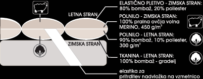 Polnino: Letna stran: 90% bombaž, 10% poliester, 300 g/m2; Zimska stran: 100% pralna ovčja volna MERINO, 450 g/m2. Bombažno polnilo je oplemeniteno s poliestrnimi vlakni. Pralna ovčja volna MERINO Woolmark kvalitete je specifičnega vonja. Idealna je za vse, ki ljubijo toploto, so podvrženi znojenju in niso alergični na naravna vlakna.