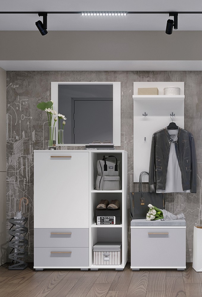Predsoba ARC 2 vključuje ogledalo, stenski obešalnik, omarico za čevlje, prostostoječo polico in komodo. Ogledalo vam bo nudilo urejen videz, obešalnik, komoda in polica pa bodo poskrbeli, da bodo vaši čevlji, ključi, pošta in ostali predmeti končno organizirani.