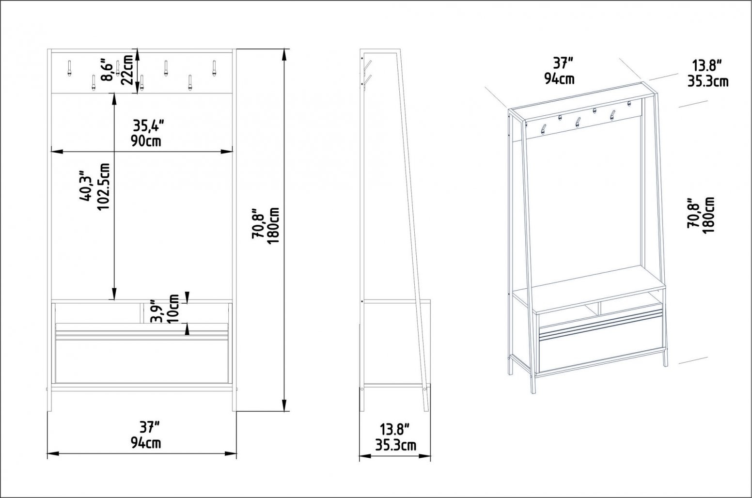 Meri 94 cm v širino, 180 cm v višino in 35. 3 cm v globino, je to stojalo zasnovano tako, da se odlično prilega vsakemu prostoru. Njegova kompaktna velikost omogoča, da ga postavite v ozke hodnike ali majhne vhode, ne da bi zavzel preveč prostora. Poleg tega ga lahko preprosto pritrdite na steno za večjo stabilnost in varnost.