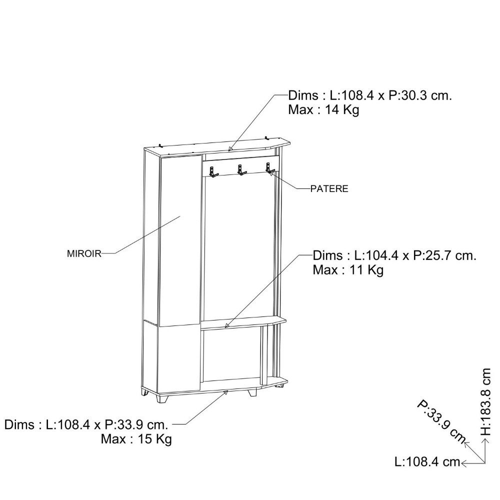 - Vrhnja plošča obešalnika lahko nosi do 14 kg. Predsobo je potrebno za dobro stabilnost dodatno fiksirati ob steno s priloženimi pritrdilnimi elementi