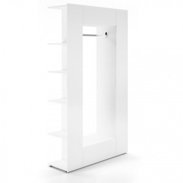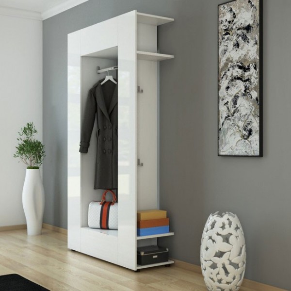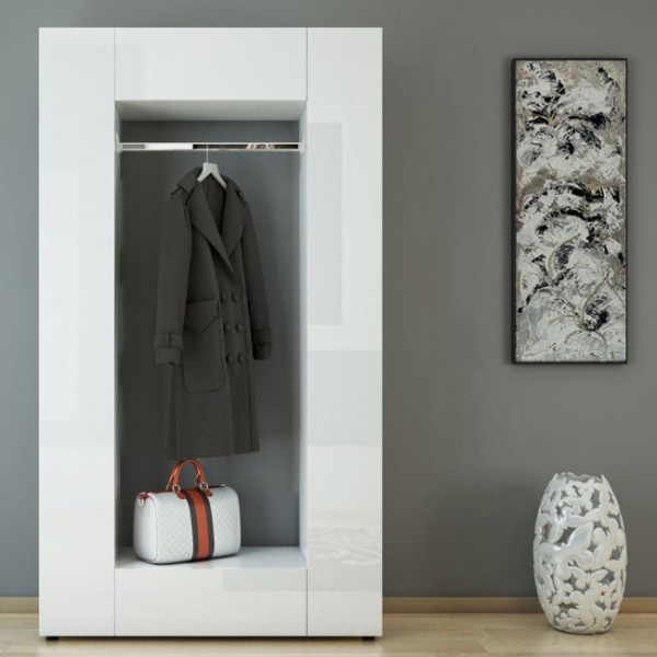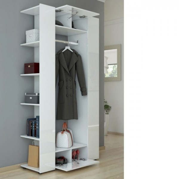 Predsoba VISA je moderna in praktična predsoba, ki je dobavljiva v beli barvi z visokim sijajem. Na levi strani predsobe so štiri police, na desni pa dve police in dve kljukici za obešanje. Oba dela sta iz sprednje strani zakrita. Zgoraj in spodaj sta dve manjši omarici, kamor lahko pospravite čevlje ali druge predmete, na sredini pa je obešalna palica.