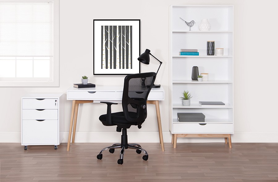 Računalniška miza NORDIC je računalniška miza v beli barvi z nogami v natur barvi. Ima predal po celi dolžini mize. Oglejte si tudi poličnik in predalnik iz tega programa.